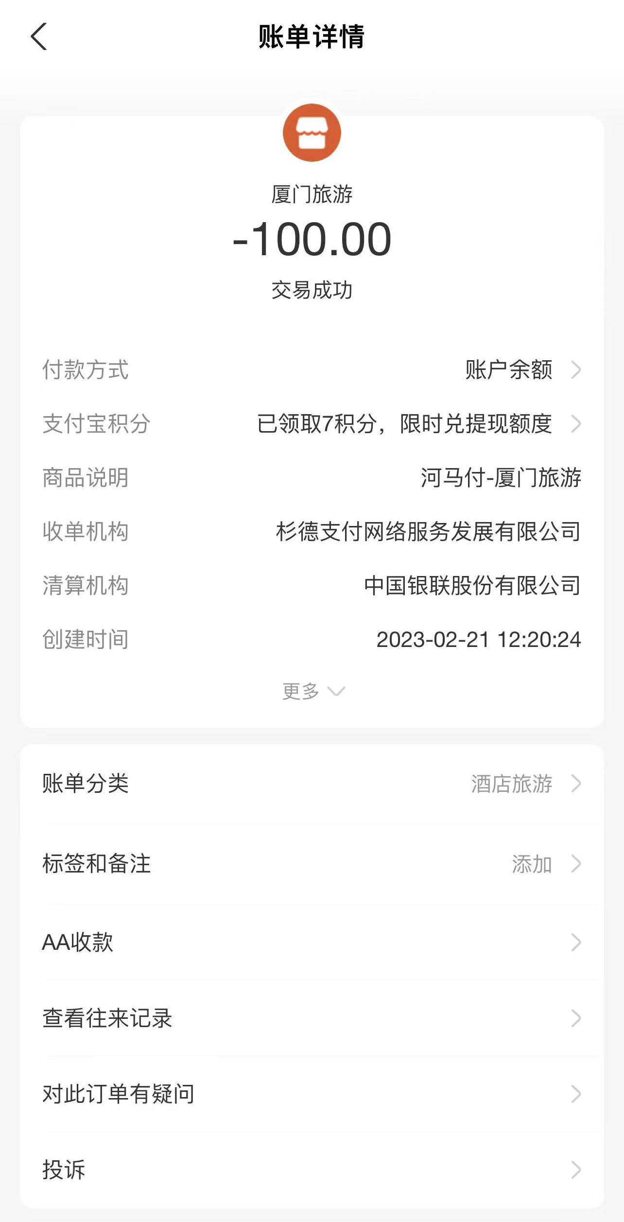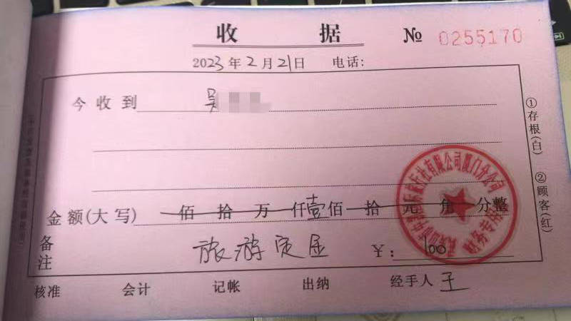 业务员承诺“定金可全额随时退还”的聊天记录 吴先生说,业务员一再表示“我们是正规旅行社公司”,并把营业执照、经营许可证等照片发给了吴先生。对方承诺旅游项目三年内有效,“定金可全额随时退还”。在此情况下,吴先生下单并交付了定金。 吴先生提供的账单截图、收据照片显示,2月21日他向武夷山市中凯国旅厦门分公司支付了100元。