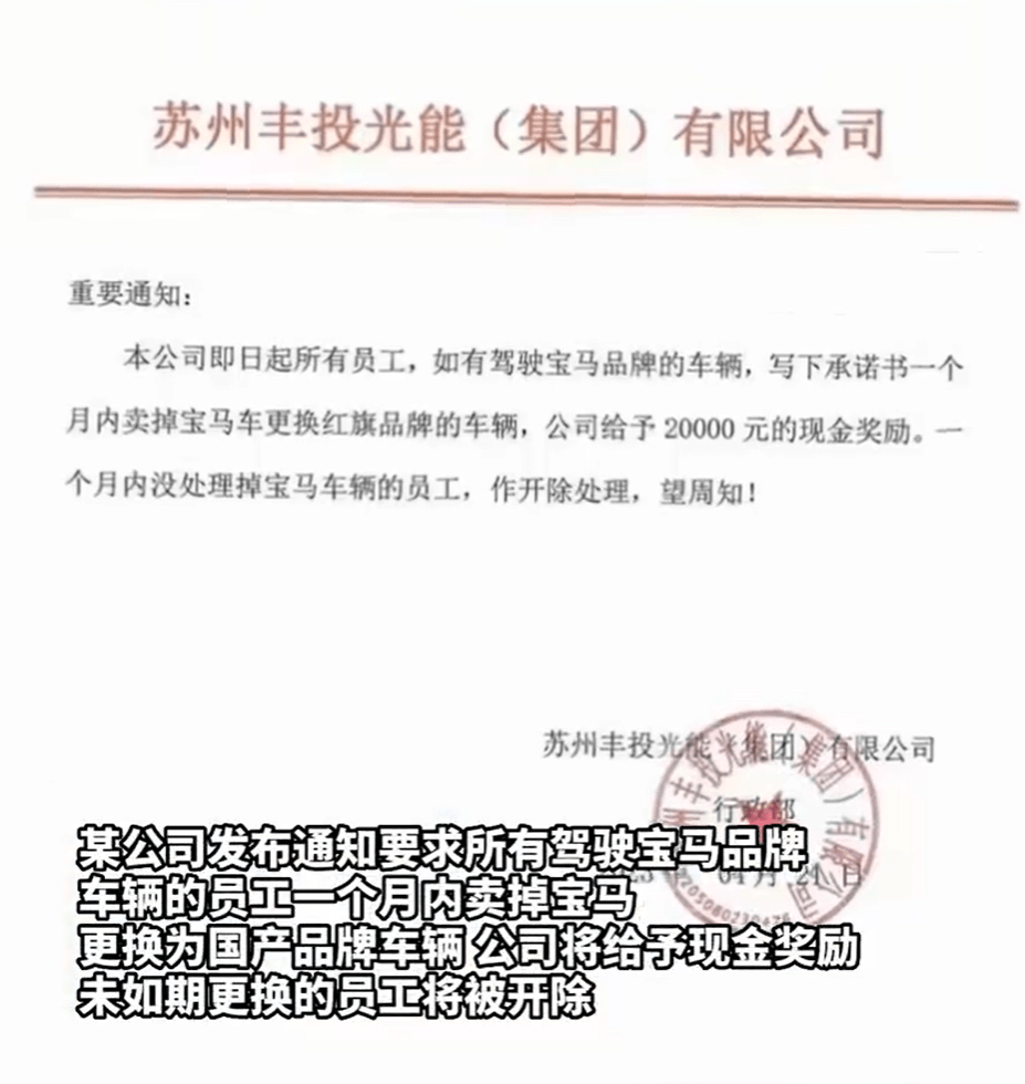4月22日,据点时新闻报道,4月21日,网传江苏苏州一公司发布通知称,要求所有驾驶宝马品牌车辆的员工在一个月内卖掉宝马汽车,更换为国产品牌车辆,公司将给予现金奖励,引起广泛关注。 网传图片显示,该通知还称,“一个月内未处理掉宝马车辆的员工,将被作开除处理。”