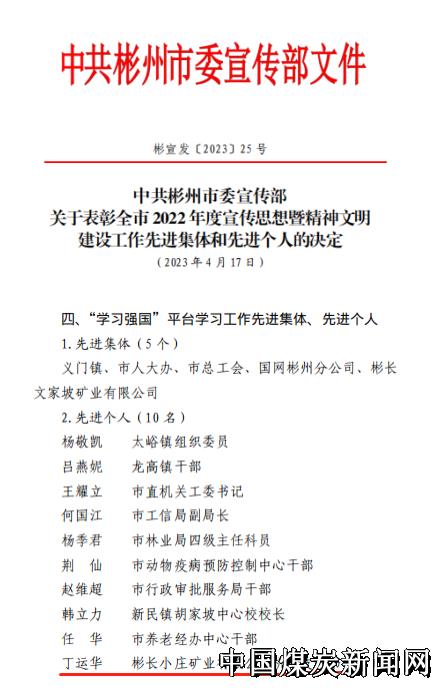【本网讯】近日,中共彬州市委宣传部下发了《关于表彰全市2022年度宣传思想暨精神文明建设工作先进集体和先进个人的决定》通知,小庄矿机关经营党支部党员丁运华荣获彬州市2022年度“学习强国”平台学习工作先进个人。 ![]() 登录学习强国平台,关注时事政治、观看视频新闻、晒学习积分……每天打卡“学习强国”已经是小庄矿全体党员干部必修课,在平台选择喜欢的频道自主学习,更是成为该矿200多名党员的固定做法。