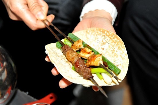 3月21日,山东淄博,食客用小饼卷起蘸了蘸料的肉串和小葱。烤肉配小葱卷饼是淄博烧烤的独特吃法。