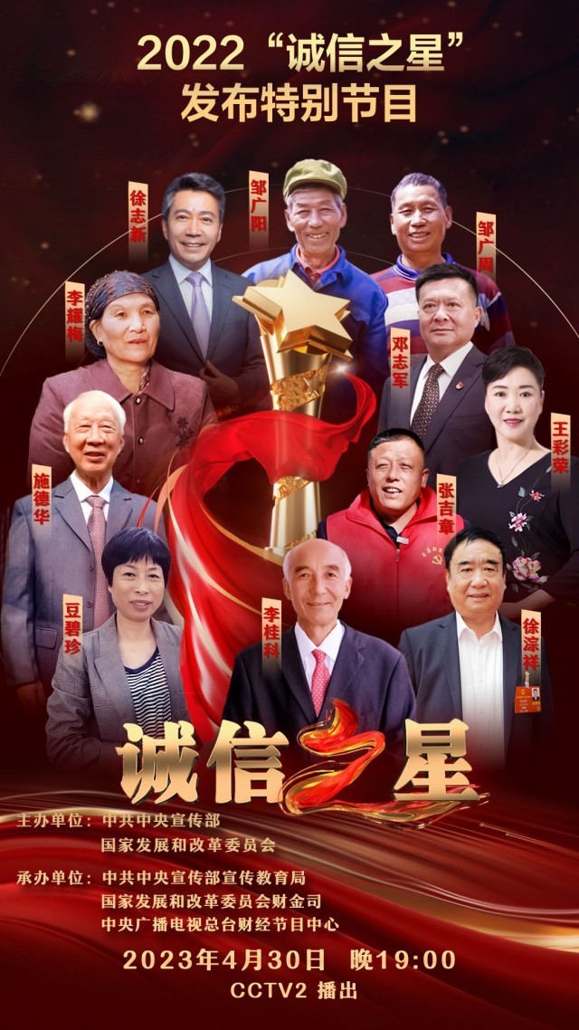 此次发布的“诚信之星”分别是:北京市盛世杰农业发展有限公司董事长张吉章、内蒙古自治区广纳煤业(集团)有限责任公司总裁王彩荣、上海市嘉定区安亭镇讴象社区居民施德华、安徽省阜阳市太和县淙祥现代农业种植专业合作社理事长徐淙祥、河南省新乡市凤泉区诚城诚信博物馆馆长邓志军、湖北省黄冈市罗田县骆驼坳镇燕窝湾村第一书记徐志新、广东省湛江市经济技术开发区东海硇洲岛回春药店店主豆碧珍、贵州省六盘水市盘州市胜境街道社区居民邹广阳和邹广周兄弟、云南省大理白族自治州洱源县疾病预防控制中心原副主任李桂科、宁夏回族自治区吴忠市红寺堡区大河乡龙源村居民李耀梅。 这些“诚信之星”均来自基层一线,具有较强的典型性、代表性。他们有的牢记初心使命、恪守职业道德,以医者仁心全情守护群众生命健康;有的坚守誓言、反哺乡里,以新思路新办法为乡村振兴献计出力;有的认真履行企业社会责任,自觉践行“诚信为民”经营理念,为疫情防控和经济社会发展默默奉献;有的重信守义、自强不息,身处困境仍坚持偿清债务、不背承诺;有的连续几十年扎根田间地头、探索科技兴农,为让中国人的饭碗端得更牢贡献力量。他们坚定守护诚信理念,模范践行社会主义核心价值观,以实际行动展现了以诚立身、诚信为本的精神风貌。 中央宣传部、国家发展改革委为这些“诚信之星”颁发了证书和奖杯。“诚信之星”发布特别节目将由中央广播电视总台财经频道于4月30日19时首播。 △视频《致敬“诚信之星”》 △2022诚信之星发布仪式主题曲《诚信之光》