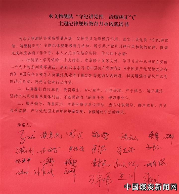 孙龙强调要高度重视纪律规矩教育月活动,将理论武装摆在首位,增强党性观念、廉洁意识,筑牢信仰之基、补足精神之钙、把稳思想之舵,拧紧理想信念“总开关”;要强担当、重实践,建新功,将廉洁主题教育学习入脑入心入骨,提高廉洁文化建设实效性,切实打牢知法敬法依法守法的思想根基;要将监督关口前移,加强纪律建设,加大问责力度,充分发挥纪检监督职能作用,以过硬作风和铁的纪律为水文物测队实现高质量发展提供坚强保证。 纪委书记龚惠民对各党支部书记、部门负责人开展集体廉洁谈话,强调要坚守初心,保持定力,讲党性,守纪律、讲规矩,带头执行纪律规矩及各种规章制度;要牢记使命,慎重用权,严格执行纪律规矩,自觉履行自身职责使命,守住“底线”,不越“红线”,不碰“高压线”;要提高廉洁自律意识,学法知法、敬法用法,用实际行动扛起全面从严治党的大旗。 与会人员集体承诺并在“守纪讲党性 清廉树正气”主题纪律规矩教育承诺践诺书上签字。