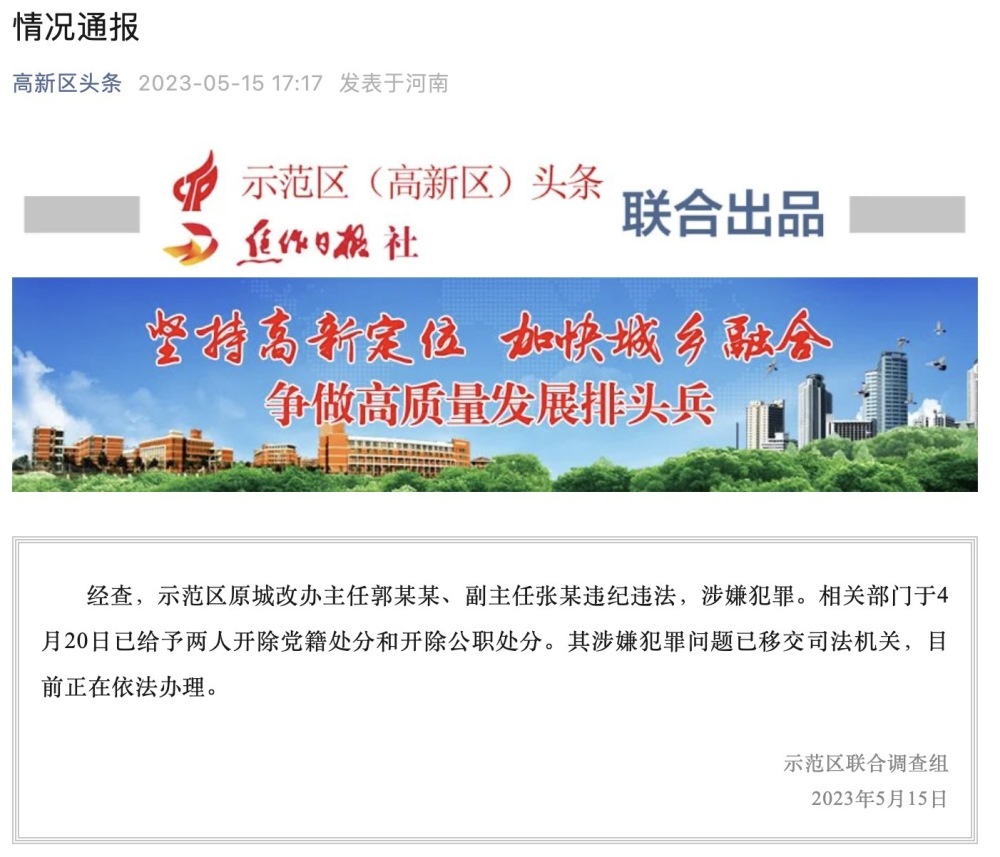 据“高新区头条”微信公众号消息,示范区联合调查组5月15日发布情况通报,经查,示范区原城改办主任郭某某、副主任张某违纪违法,涉嫌犯罪。相关部门于4月20日已给予两人开除党籍处分和开除公职处分。其涉嫌犯罪问题已移交司法机关,目前正在依法办理。 此前,示范区联合调查组2月21日曾通报,网传示范区某工作群中出现城改办主任不雅信息一事首发于2023年1月18日。事发后,示范区党工委高度重视,于1月18日下午就对涉事的城改办主任郭某某、副主任张某进行了免职处理。同时成立联合调查组就相关问题进行调查处理。