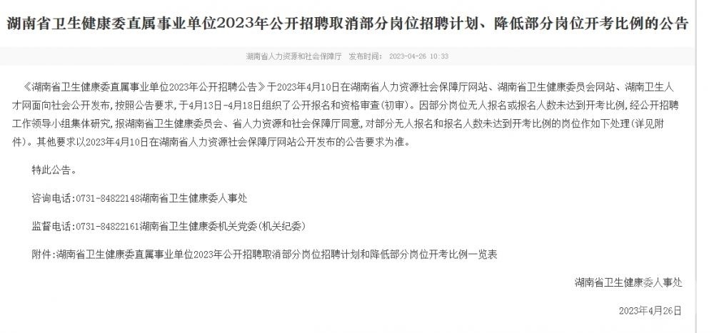 4月,湖南省卫生健康委人事处也发布公告称,因部分岗位无人报名或报名人数未达到开考比例,经公开招聘工作领导小组集体研究,报湖南省卫生健康委员会、省人力资源和社会保障厅同意,对部分无人报名和报名人数未达到开考比例的岗位作取消岗位招聘、降低部分岗位开考比例处理。从相关表格来看,湖南省妇幼保健院取消内科医师、胚胎实验室技师、放射技师等多个岗位的招聘计划,湖南省儿童医院取消儿童保健所技师、护理人员、康复中心技师等多个岗位的招聘计划。湖南省人民医院(湖南师范大学附属第一医院)取消综合内科医师等多个岗位招聘,上述医院均为三甲医院。记者注意到,上述取消岗位多要求硕士研究生及以上,年龄要求多在35岁以下,有的还要求30岁以下,岗位普遍还有细化的任职要求、资质以及相关工作经验。 上游新闻记者 朱婷 图片来源/各地卫健委官网、网络