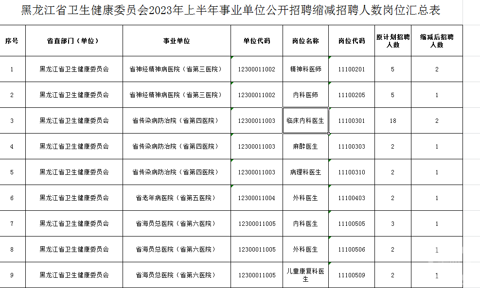 5月15日,“多地三甲医院招聘无人报名”的消息在网络流传,引发广泛关注。其中提到,黑龙江、江苏、湖南、四川等地,许多招聘岗位来自当地三甲医院。上游新闻(报料邮箱baoliaosy@163.com)记者通过查询相关官方网站以及采访多家相关医院发现,上述地方近期公招的确出现一些三甲医院岗位无人报考的情况,原因多样。 15日,上游新闻记者在黑龙江省卫生健康委员会官网发现,今年3月,黑龙江省卫健委曾发布2023年度所属事业单位公开招聘工作人员公告,面向社会公开招聘编制内工作人员143名。公告计划表可以看到各单位具体招聘人员数量和要求。从学历来看,普遍要求全日制本科及以上,部分岗位除要求具备相应资格外,还要求相应医师规培证。此后,黑龙江卫健委又发布了该考试招聘取消、缩减部分岗位招聘计划公告。从相关表格来看,取消了15个岗位,比如黑龙江省神经精神病医院的急诊科医师、介入科医师等,黑龙江省传染病防治院的临床外科医生、放疗科医生等。从缩减岗位来看,一些计划招聘多人的岗位,缩减后普遍只招聘1-2人,如黑龙江省神经精神病医院各招聘精神科医师、内科医师5名,缩减后各招聘2人、1人;黑龙江省传染病防治院临床内科医生岗,原计划招聘18人,缩减后招聘2人。
