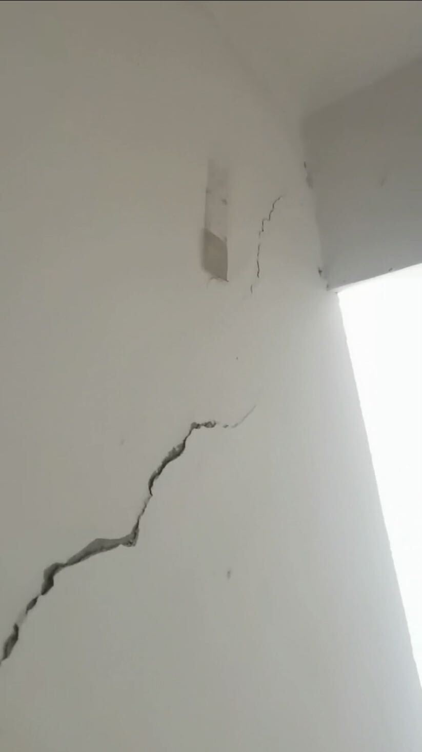 物业还是没有派人去现场制止,只是给三楼的租户打了个电话,“我从四楼业主那听说,当时3楼的租户告诉物业,自己没砸承重墙”。 到下午四点半,董丽的丈夫被噪音震得受不了,头痛得厉害。于是,董丽去三楼看了一眼。 “三楼的租户看起来三四十岁,高高瘦瘦的,具体干什么的、哪里人不知道,我到了之后他把我堵在门外,我说我就是来问一下什么时候停工,家里的病人实在是受不了这么大的噪音了,后来那个人说5点停工,我就先回家了。” 当天,利民学苑的业主们都没有想到,B栋的承重墙已经被损坏了。 4月28日早晨,第一道裂痕被发现。 “28日早晨7点多,402业主家的儿子躺在床上,发现墙上有巨大的裂缝,他告诉了左右邻居,又给物业打了一个电话。后来401的业主告诉我说402的墙上有了大裂缝,这时候我才意识到事情的严重性。” 那天,B栋业主陆续在家里发现了裂缝,有人向相关部门反映,也有人报了警,还有人把3楼装修的视频发到了网上。 “3楼那个租户把一层都租了下来,把4户都凿通了,整个三楼像个大操场一样空空如也,承重墙那裸露出了2.6米的钢筋,就是网上视频放出来那样。”董丽说。