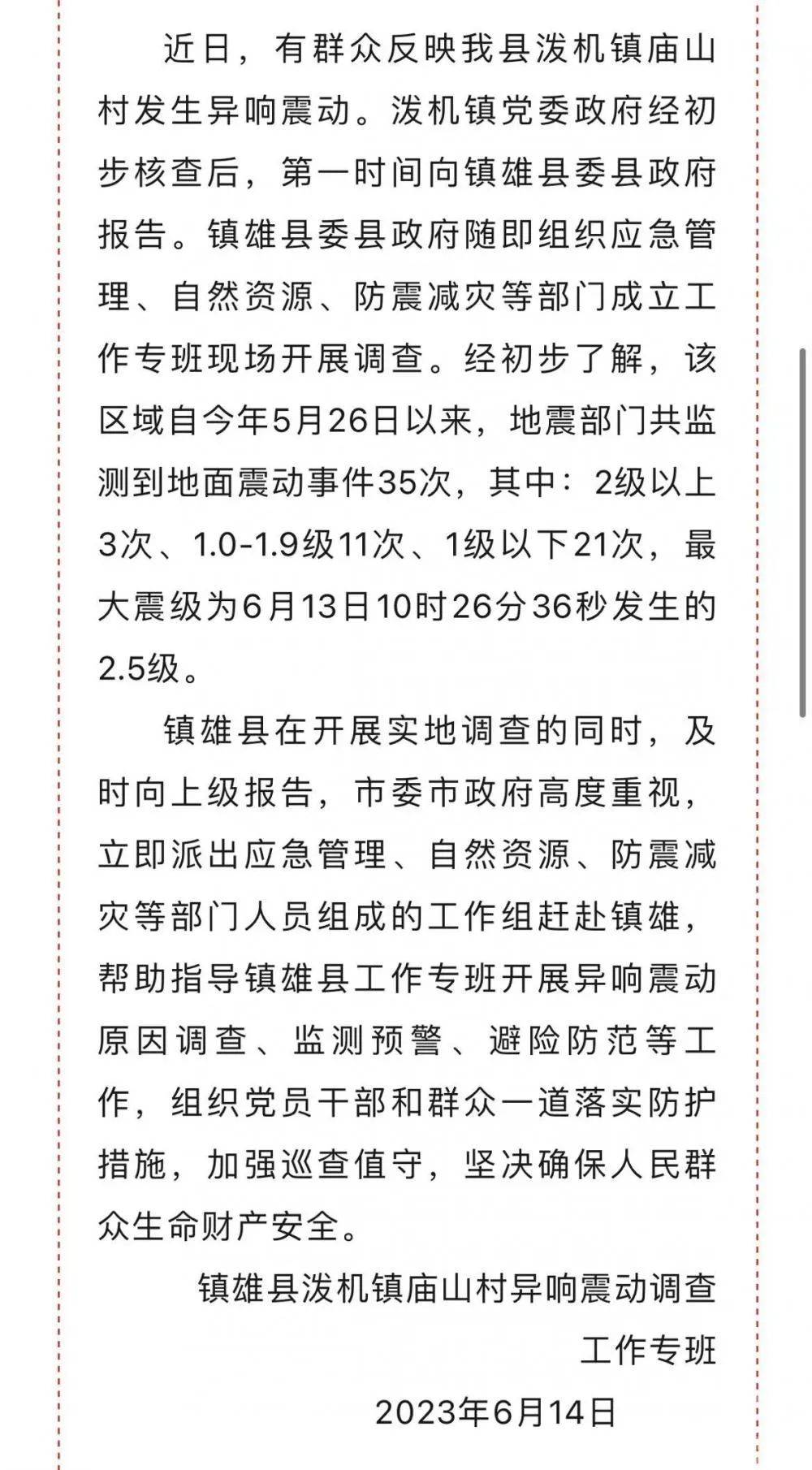 另一位村民王大姐则向记者回忆说,最开始是5月底的一天清晨发生了震动,刚开始村民们都以为是地震,但这一现象后来一直持续,对于事件的原因大家都比较关注,担心会影响财产、生命安全。多位当地村民证实,地面震动时的声音和煤矿开矿放炮时的声音很像,但王大姐说之前从未出现类似的情况,“煤矿都开了好多年了,也没有出现过类似的情况,不知道为什么。” 6月15日,镇雄县应急管理部门的工作人员受访时表示,他们初步核实情况显示,近期庙山村附近煤矿没有开展过放炮作业,炸药等设备也都没有入井,“震动和煤矿的关系应该不大。” 镇雄当地就“20天地震35次”发出的情况通报。/微镇雄