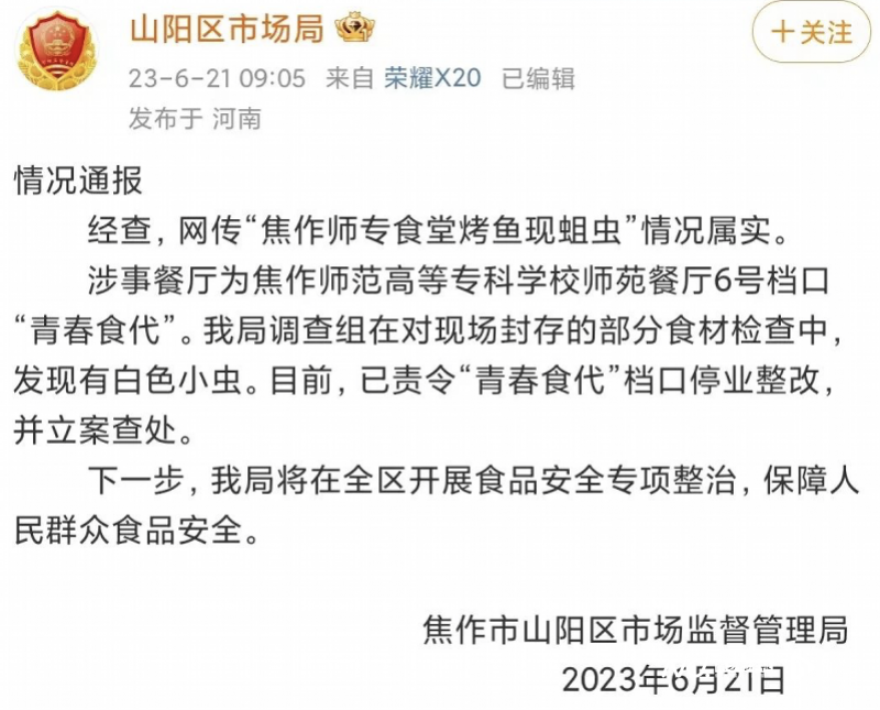 近日,一则在焦作师专食堂吃烤鱼时,发现烤鱼上有蠕动的小虫的视频引发关注。 6月21日,焦作市山阳区市场监督管理局发布情况通报称,涉事餐厅为焦作师范高等专科学校师苑餐厅6号档口“青春食代”,该局调查组在对现场封存的部分食材检查中,发现有白色小虫。目前已责令“青春食代”档口停业整改,并立案查处。 不遮掩,反应快,打消了网友对监管部门再次“指鼠为鸭”的担心。 一方面,食品安全向来是公众关注的焦点,另一方面,不久之前刚刚发生了“指鼠为鸭”事件,网友难免会将两起事件相互对比。 在沸沸扬扬的“指鼠为鸭”事件之后,以此为鉴是一个强烈的共识。 正如人民日报旗下账号@侠客岛发表评论所说:鼠头还是鸭脖?要证实并不难,但因有关单位和稀泥、“堵捂瞒”,硬是把小事拖大、矛盾上交,搞得全网舆情沸腾,要靠省级调查组介入才能查清。这期间,浪费了大量行政资源,更伤害了基层政府和有关单位的公信力,真是得不偿失!充分暴露了有些地方部门一有舆情就遮掩逃避,不作为、懒作为的工作作风。 监管部门的工作作风当然必须整改。此外,面对学校食堂安全事件频发的现实,还需要深挖根源。 众所周知,当下学校食堂均要经过招投标来确定经营者。企业要想进入任何学校的食堂承包经营,都有一套严格的程序,并非易事。但据媒体披露,“指鼠为鸭”事件中的涉事公司“全国范围内在营高校食堂项目700多个,年营收规模直逼海底捞”。 这家公司在高校如此受欢迎,是源于其市场竞争力强大,还是有其他原因?背后是否存在利益输送?这些问题当然不能轻轻放过,因为只有这样,才能从源头上阻断学校食堂安全事件的频发。 指鼠为鸭事件的通报中明确表示,“下一步,将依法依规严肃处理相关责任单位、涉事企业和责任人。”相信上述问题正在紧锣密鼓地调查之中。 现在,又一起学校食堂安全事件发生了,又有可能引发新的舆情。深挖问题根源的调查,需要有紧迫感。