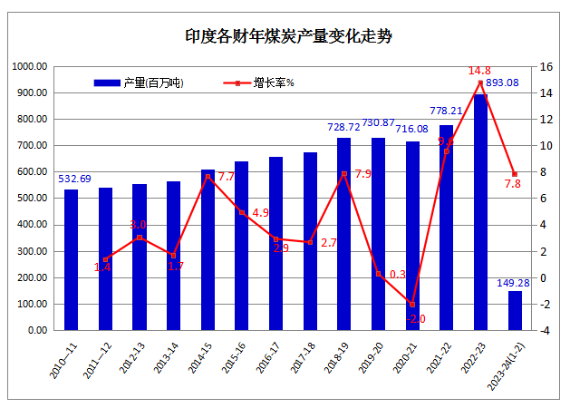 | 印度计划2023-24财年煤炭产量目标为10.12亿吨 同比增长13% | |||