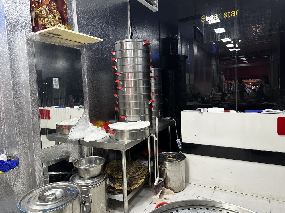 即使这样,高洋还是欣慰于淄博这座宝藏小城终于被更多人看见了,唯一让她感到遗憾的,是八大局市场内大部分人的无奈转型。 其中就有郑丽(化名)的店。现在,郑丽的包子铺开在八大局南门入口的第三家店,红彤彤的招牌崭新又显眼。 站在店外,看着叠放堆高的蒸屉、成排放好的两个豆浆机,仿佛和一般的早餐店没有两样。但是走进店内,墙上没有抠干净的英文字母、被镜子包围的柱子、被推到墙边的前台柜台、漆黑的镜面墙面,都时时刻刻提醒着,这里本是一个理发店。店内原本的桌椅、镜子都被撤走了,取而代之的是煤气罐、冰箱、食材原料。