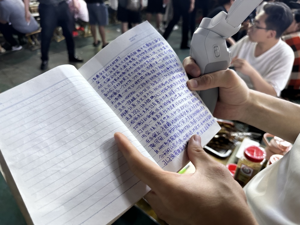原以为靠近八大局就是靠近了流量密码,但没想到等到五月中下旬筹备完开业,游客已经减少了大半,李梦的店夹在十几家店的末尾,更鲜有游客经过。只在刚开业的前几天,有翻台现象,后来客人寥寥无几。 被问到接下来打算如何,李梦说“只能继续坚持,至少要坚持到暑假、国庆节再看看”。 郑丽和李梦一样,虽然八大局的游客正在减少,但她看着自己新买的满屋子设备,有些进退两难,也打算至少要坚持到国庆,“我还要多做一些品种,明天要推出小龙虾口味的包子。” 如果成功转让,回家陪儿子度过关键期后,袁姐和丈夫还是打算再回到淄博重新开始,“以后还是要回来继续赚钱的,淄博是个好地方。” 来来去去的人不计其数,但淄博依旧承载着希望。 从“五一”开始,27岁的淄博本地主播阿哲每日都会前往牧羊村烧烤门口直播,将手机镜头对准牧羊村的门店招牌,用一口标准的播音腔,不时回答着观众们的问题。即使直播间人数从“五一”高峰时的2万人,掉落到了如今的两位数,但作为本地人,他还是对淄博充满希冀和自豪。 他身后的背包里有一个笔记本,手写了一整本他的“导游词”功课,还摘抄了一篇文章,只要有人问到“淄博会火到什么时候?”他就会念出文章的观点,“淄博会一直火,从星星之火燎原成熊熊大火,最后火遍全山东,火遍全中国,火遍全世界……”