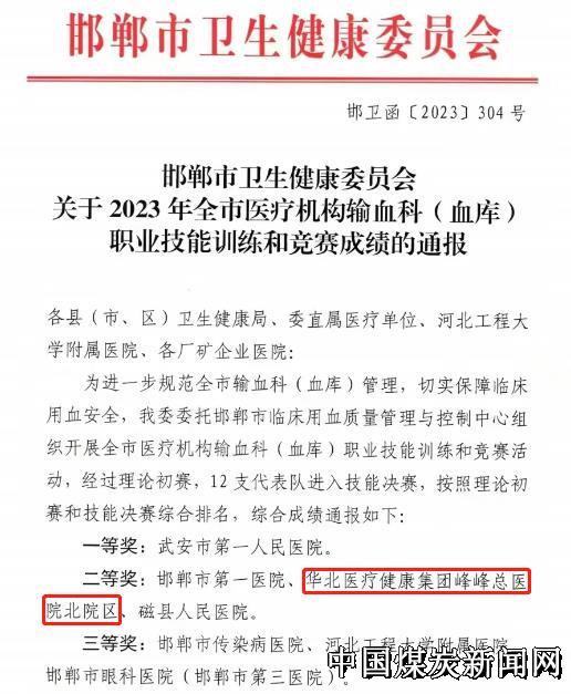 【本网讯】近日,在邯郸市卫健委2023年全市医疗机构输血科(血库)职业技能训练和竞赛中,峰峰总医院北院区荣获团队二等奖好成绩!