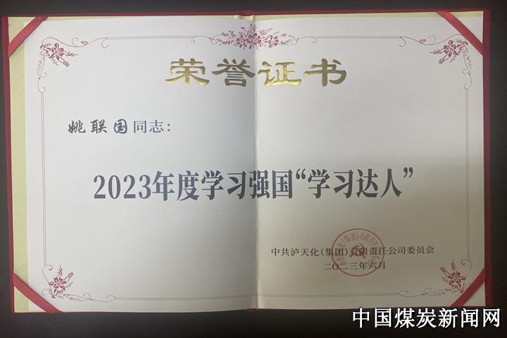 【本网讯】近日,泸天化集团表扬了2023年度“学习强国”学习平台运用较好的先进个人,鲁班山北矿姚联国同志荣获“学习达人”荣誉称号。