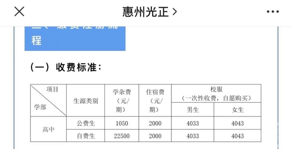 7月17日,广东东莞光正实验学校高一新生校服收费4000余元一事,引发广泛关注。该学校官网显示,该校为十二年一贯制民办公助性质的全寄宿学校,隶属于广东光正教育集团。 上游新闻(报料邮箱:cnshangyou@163.com)记者查询发现,除东莞光正实验学校外,广东光正教育集团旗下的惠州光正实验学校、东莞光明中学等学校,也在各其公众号招生信息中提及4000余元校服费。其中,东莞光明中学初中部(东莞光明初中)的公众号文章显示,初高中校服费用为男生4033元(31件)、女生4043元(30件),与惠州光正实验学校、东莞光正实验学校的收费标准及衣服件数相同。其中,东莞光明初中的服装明细显示,男女校服均分为夏季运动系列、夏季礼服系列、冬季运动系列、冬季礼服系列和某运动品牌共5个系列。服装包括运动衫、短裤、运动鞋、衬衫、西/裤裙、冲锋衣、毛背心、礼服西装、皮鞋、棉袜/裤袜(两双)、风衣卫衣、校徽等。