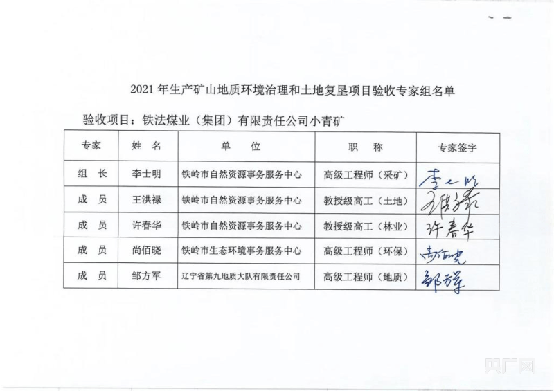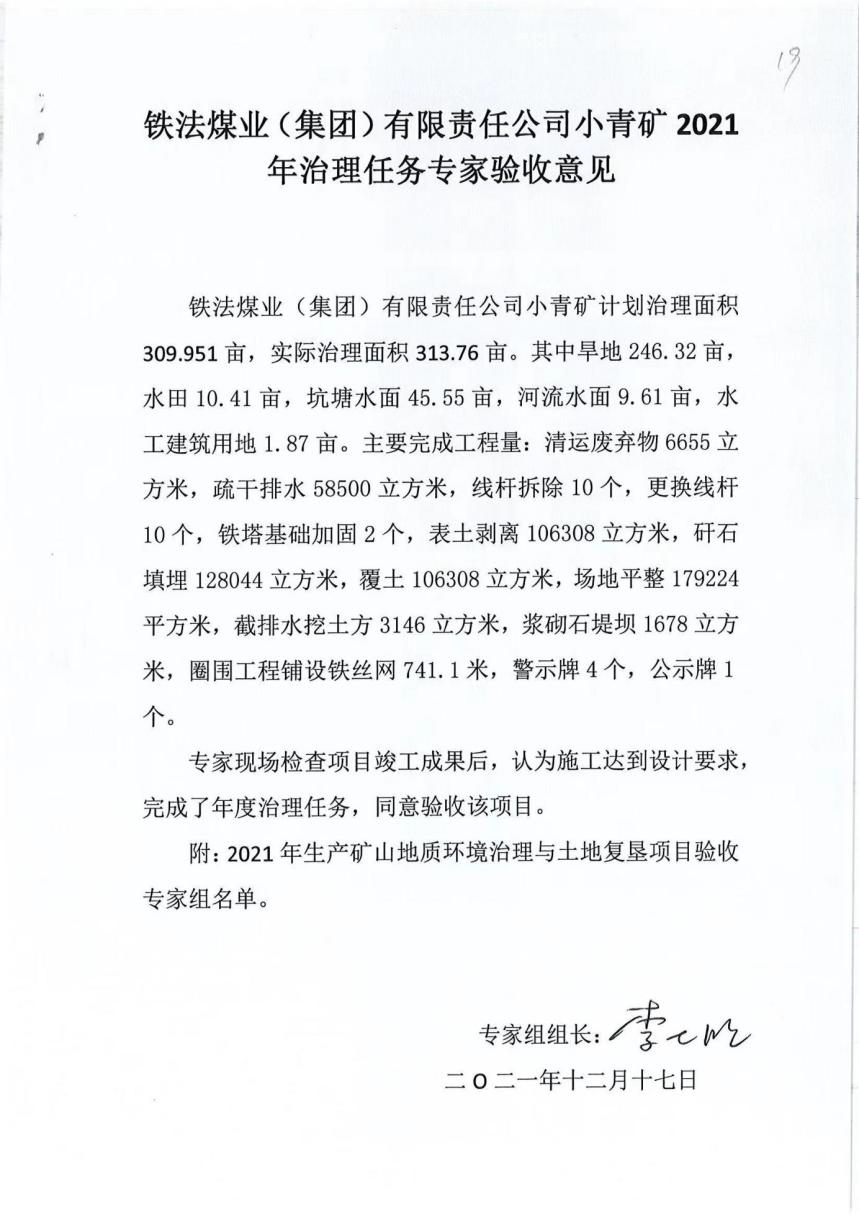 铁煤集团小青矿2021年治理任务专家验收意见(铁煤集团供图)