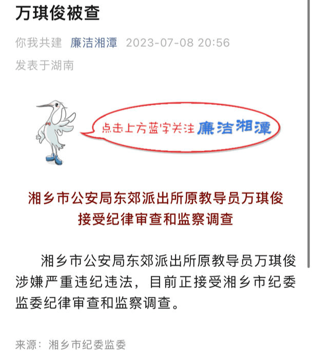 封面新闻记者 石伟 7月8日晚,湖南省湘乡市纪委监委发布通报,湘乡市公安局东郊派出所原教导员万琪俊涉嫌严重违纪违法,目前正接受湘乡市纪委监委纪律审查和监察调查。