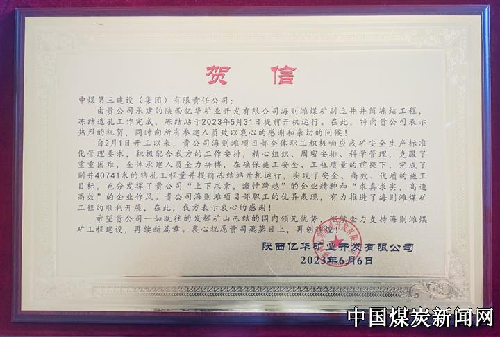 | 中煤矿建特凿公司海则滩项目部喜获甲方贺信 | |||