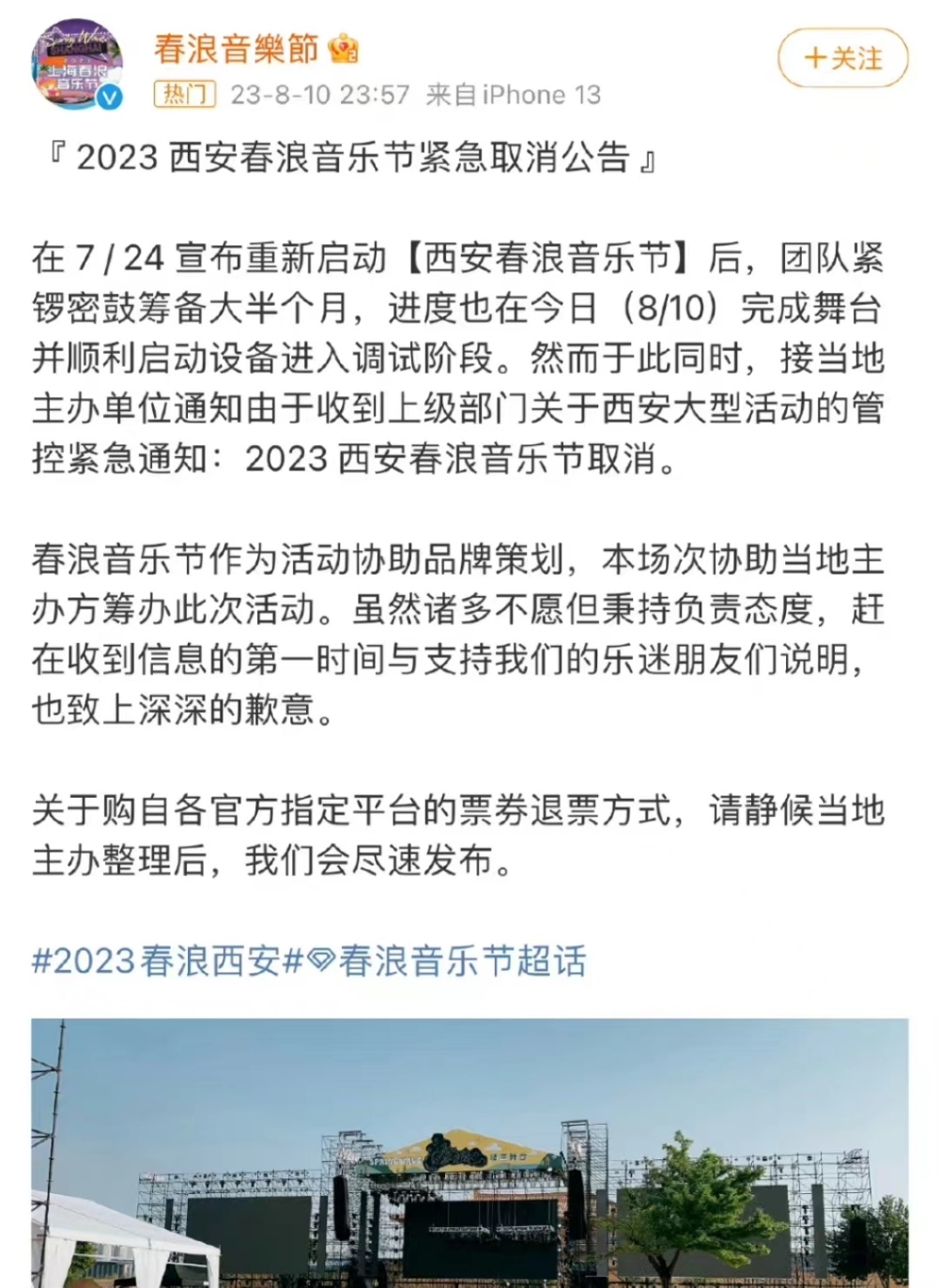 8月10日晚11点57分,西安春浪音乐节官方微博发布公告。公告称,接当地主办单位通知,由于收到上级部门关于西安大型活动的管控紧急通知,筹备了大半个月的西安春浪音乐节被取消。 西安春浪音乐节原定于8月11日和12日在大明宫国家遗址公园举行,阵容包括了陶喆、MC HotDog热狗、张震岳、脆乐团等知名歌手和乐队。 8月10日下午6点,春浪音乐节还发布了一条音乐节出行指南。 公告一出,立即引发了网友们的热议和质疑。有期待许久的乐迷们表示不敢相信这是真的,有人表示很气愤和不解,有人表示“2023欧亚经济论坛9月在西安举办,大型文娱活动应该都会延期”,还有人怀疑和TFBOYS十周年演唱会有关。据悉,演唱会现场,出现了粉丝推倒安检门、带刀进场、打架斗殴等严重失控情况。有人认为这可能导致了西安市政府对大型活动的管控加强。 但8月11日早上,春浪音乐节官方微博删除了此条公告。难道事情有了转机? 8月11日下午3点左右,正观新闻记者联系到主办方西咸新区秦汉新城森林娱乐文化传播有限公司,对方表示,音乐节已经确定取消,“也是临时接到通知。”当被问及为何删除公告时,对方表示,原因暂时不方便告知,“在今天下午5点左右,我们会尽快发出公告,原因也会讲清楚的。” 关于期待已久的乐迷,对方回应,“已经购完票的,可以按照购票途径,陆续原路退票。” 同时也有部分粉丝已经到达西安,酒店、交通等均已安排完毕。对此,对方表示,“针对已经到达西安的乐迷们,我们还正在积极协商解决赔偿方案。” 不久后,记者发现微博有不少网友晒出收到“大麦网退票”的通知短信。 此外,继西安春浪音乐节官宣取消后,网上还有不少“西安8、9月份将取消多场演唱会”“五月天、刘若英等西安演唱会都被取消了”等消息流传。