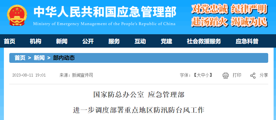 8月11日,国家应急管理部网站发布消息,国家防总办公室、应急管理部进一步调度部署重点地区防汛防台风工作。
