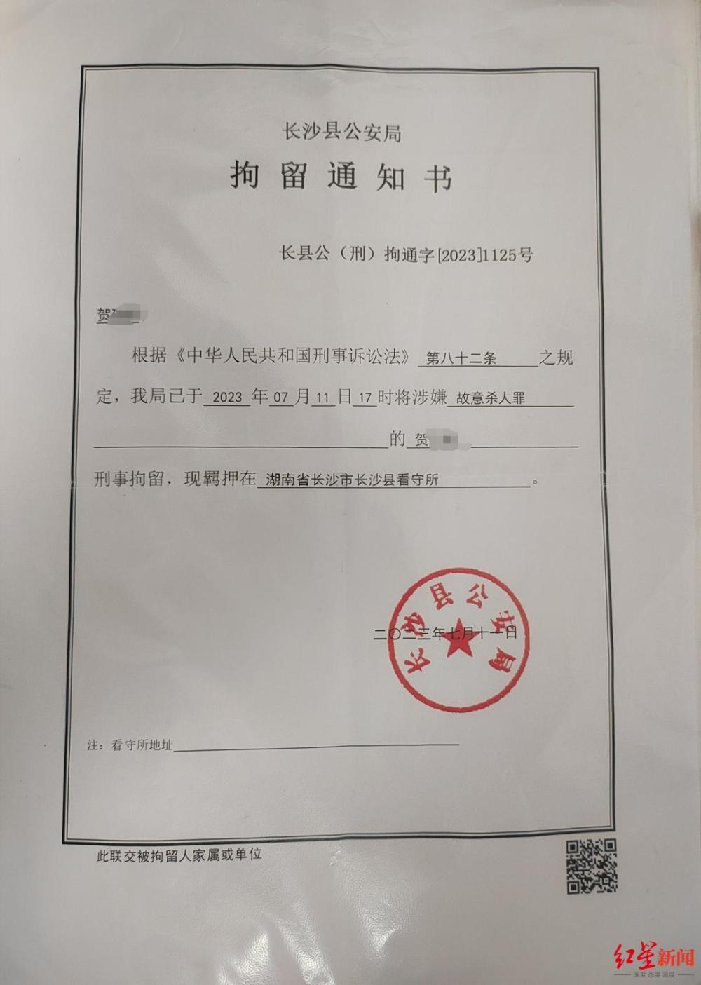 贺父介绍,儿子几年前还曾因从事非法活动牟利,受过法律制裁。记者获取的一份裁判文书显示,2020年9月,贺某曾被当地法院以开设赌场罪判处拘役4个月,缓刑8个月,并罚款一万元。 6月20日《寻情记》节目播出后,在行政机关工作的黄某被辞退。据张韵家属和同事介绍,黄贺二人也曾先后到张韵所在公司投诉闹事。聊天记录截图显示,6月23日,贺某母亲还劝张韵,“不要到别人家单位和家里去,以后去(出)了事,还是自己受落。”婆婆多次和她强调,“去(出)了事后果你自己负责。”“以后怕去(出)什么大事,必定还有孙女。” 记者了解到,在7月10日事发前,贺某已经多次蹲守在张韵公司楼下。张倩是张韵堂妹,和张韵在同家公司上班,6月下旬,她曾接到堂姐信息,说看见贺某的车又停在公司门口堵人,“姐姐让我也小心一点,她怕牵累到家人”。 7月10日下午,两人17岁的女儿婷婷放假回家。婷婷回忆道,母亲张韵还未下班,贺某问他们离婚了自己想跟谁生活。由于一直是张韵在照顾女儿的生活起居,她毫不犹豫站在了母亲一边。在得知她的态度后,贺某生气地让她滚,婷婷便拖着刚从学校带回来的行李箱准备到公司找母亲。从家到张韵公司打车只需要十几分钟,她没想到的是,贺某也驾车尾随其后。得知女儿到楼下后,张韵下楼准备给女儿送钥匙,还特地拿了一袋零食。她还对同事说,她回来时会帮他们把外卖也一起捎上来。 还没等母女俩走近,悲剧就已经发生。“监控显示,贺某当着女儿的面,从身后直接杀了我妹妹,她甚至都没有喊出一声救命。”张琴说,当时17岁的婷婷被吓住了,拨打110报警,反应过来后,她提起行李箱砸向父亲贺某,可惜力量悬殊,“怎么砸也砸不动,行李箱都凹陷了一块。”她只好找附近的保安帮忙。 17时43分,婷婷给张琴拨打了两通一分多钟的语音电话,“电话里,她说爸爸拿刀伤了妈妈,我当时还以为只是轻伤,让同公司工作的堂妹放下手头的事赶紧下楼看看。”挂断电话,瞒着有心脏病的张母,张琴带着张父从宁乡往长沙赶。 几分钟后,张琴在加油站附近接到了堂妹张倩的电话,说人已经没了。张倩回忆,她下楼时,张韵已经倒在血泊中,白裙子染上了血,“刀还在脖子上。”她要带给女儿的零食袋,和女儿的行李箱也散落在一旁,染了血迹,婷婷在旁边一直哭。张倩看到,贺某当场被警察制服,双手沾满了血迹。 一份警方出具的死亡证明显示,双方因家庭纠纷产生矛盾,报警人父亲自驾至母亲上班地,持刀杀害。联系120到场后,伤者因失血过多抢救无效死亡。后长沙县刑侦技术人员、法医至现场勘查,确认其已死亡。7月11日17时,贺某因涉嫌故意杀人罪被刑事拘留,羁押在长沙县看守所。