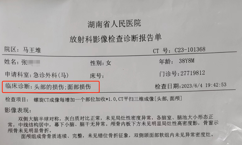 “他气急败坏回家抢手机还家暴我,把手机摔坏把电话卡取出并剪掉。”当晚,张韵向二姐张琴发了一条信息,说贺某因为她发现他的秘密,为了销毁证据打人。湖南省人民医院的诊断报告单显示,当晚7点多,张被急诊科诊断为头部和面部损伤。 不敢回婆家,怕突然出现的丈夫家暴,也不甘心辞职回娘家,张韵就寄住在一位同事家。“她们同事很仗义,想着每天一起开车上下班,比较安全一些。”张琴介绍。 《寻情记》节目中,两家人曾于6月上旬在贺家商谈此事。张父质疑女婿为何对女儿家暴,贺某避而不谈,只表示想尽早离婚,有什么事上法院。贺某父亲也恨铁不成钢,表示支持儿媳以重婚罪起诉儿子,让儿子受到应有的惩罚,“关十几二十年都可以。”随后贺某离开客厅走进了厨房,张韵坐在一旁不语。