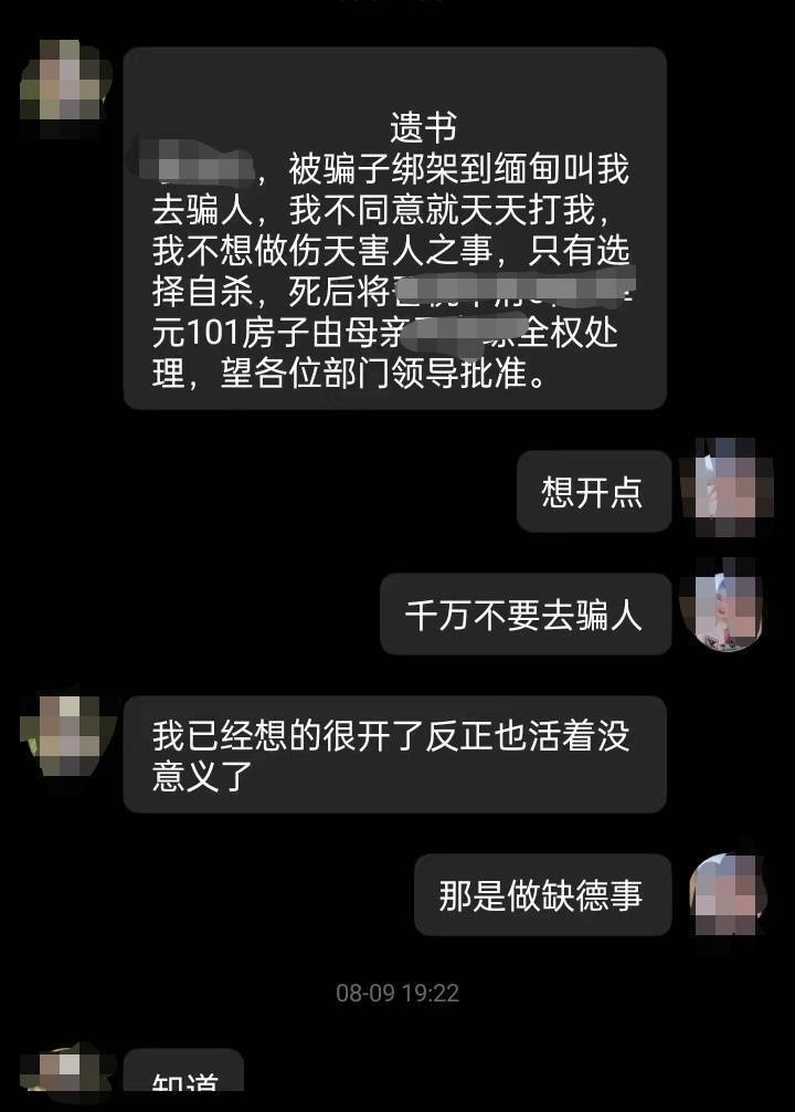 被困 尹女士介绍,刘建曾把家人拉进一个临时群,讲述了自己的现状。 他说,诈骗团伙让他骗6个人过去,一个人算5万,骗够人数之后放他。“他说骗他的那个人已经被放回国了,但那个人的名字、微信头像都是假的,不知道是谁。” 尹女士几次忍不住埋怨:“你没有想想,天下有那么好的事,你有文化有能力吗,头脑够用吗。我们都比你聪明,可以去的话早就去了。” 刘建回复:“想赚钱想疯了。就是想赚一笔钱,谁知道过来被卖了,后悔也没有用了。” 尹女士询问,今天有没有挨打。刘建回复,没有招到人就要被打10-20下。在聊天记录中,他几次说“坚持不下来了,想从9楼跳下去,就当没有我了。” 13日中午,刘建给尹女士留下一段话:“我可能没有活的机会了,我想清楚了,谢谢你带我来到这个世界,谢谢你养我这么大,谢谢你了。”