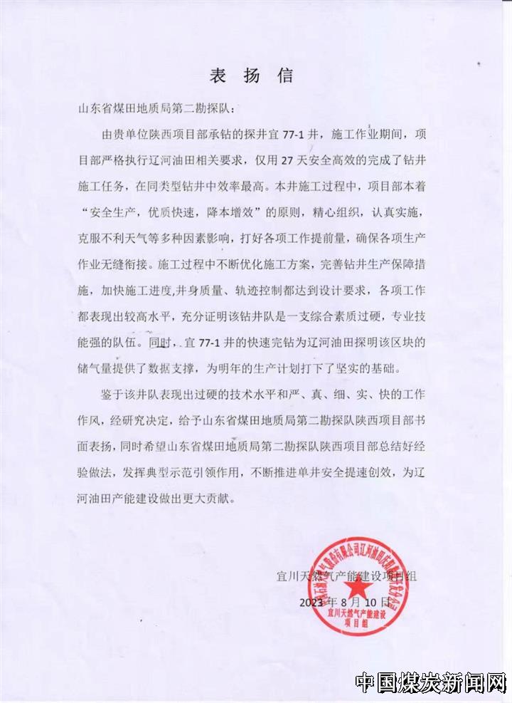 | 山东省煤田地质局二队陕西油气井项目获甲方书信表扬 | |||