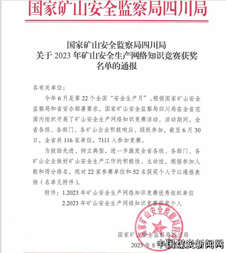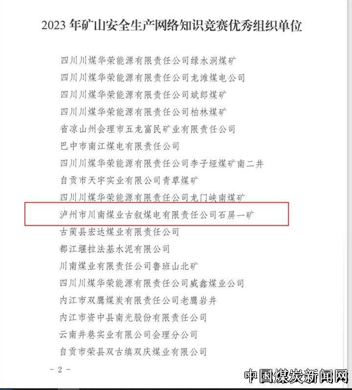 | 四川古叙煤田公司石屏一矿获2023年矿山安全生产网络知识竞赛优秀组织单位 | |||