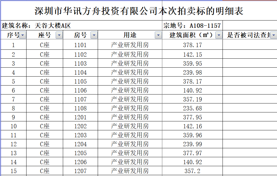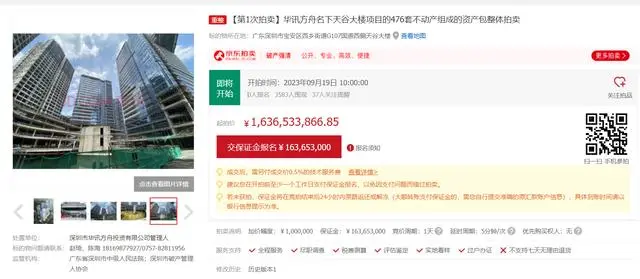 据原华讯方舟投资方面一位李姓负责人介绍,“因为签约补充协议是动态的,截至8月22日下午,已经有130多户业主签了相关补充协议。” 8月23日下午,北京金诉律师事务所主任律师王玉臣通过微信在接受每经记者采访时表示,“相关协议的部分内容调控对业主来说极为不利,如果签署了相关协议,业主就要放弃很多的权利,尤其是在尚未有定论的情况下就放弃了大量的权利。作为业主而言,有权拒绝签署这份补充协议。此外一定要注意,只要进入破产流程,一定要对破产的每一个流程,每一个节点都要密切关注,充分行使自己的权利。” 王玉臣指出,尤其要特别注意破产重组中各类决议的草案内容、方案内容,千万不要盲目投票,一旦投票通过再发现有问题就悔之晚矣。站在业主的角度来说,业主可以团结起来,在破产重组中更好发挥自己的优势和力量,更好为自己发声。毕竟在破产重组中,涉及很多类型的债权人,是多方博弈。 资金缺口约7.7亿,正寻找接盘方 每经记者注意到,目前华讯方舟投资名下天谷大楼项目的476套不动产,已经被摆上法拍货架。 在京东法拍上,名为“华讯方舟名下天谷大楼项目的476套不动产资产包”整体拍卖,首次拍卖的起拍价为16.37亿元。