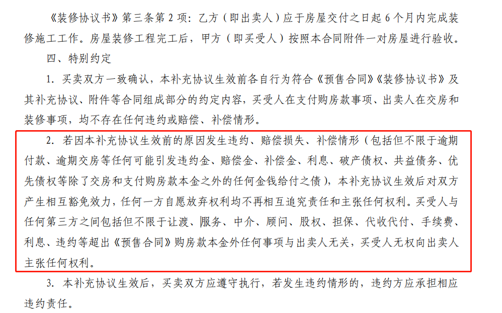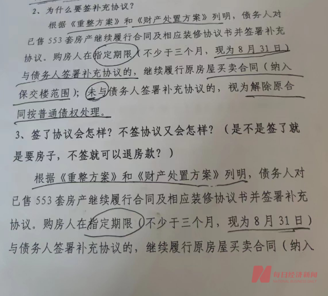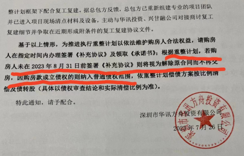另一位业主谢勇则补充道,“我们只认同购房合同。华讯方舟已经破产,没有资格让我们签署这些协议。这些协议不是政府和法院行为,是华讯方舟投资想推卸责任的单方面协议。” 每经记者当日还在现场获得政府专班人员提供的一份文件显示,该补充协议主要与债务人签署,签署的截止日期为8月31日,签署后将继续履行房屋买卖合同(纳入保交楼范围);未与债务人签署补充协议的,视为解除原合同按普通债权处理。