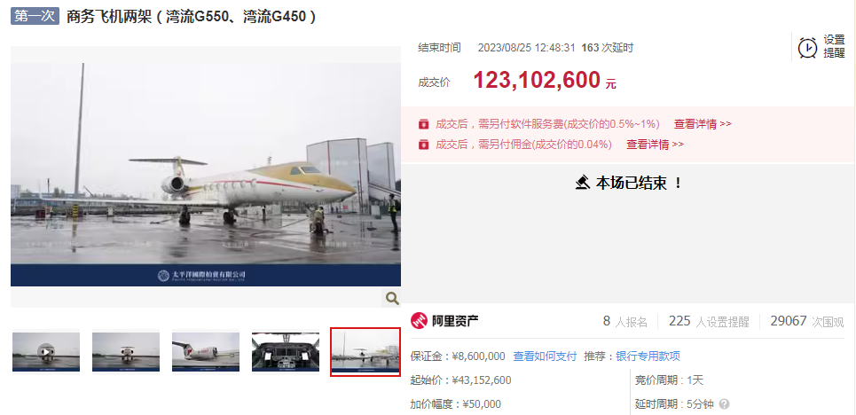 红星资本局8月29日消息,停飞4年多的两架商务飞机于近日以1.23亿元的价格迎来新主人。 阿里资产平台显示,湾流G450型、湾流G550型这两架飞机的起拍价为4315万元,共8名买家参与拍卖,经过183次出价后,竞买号为“F3014”的买家相较上一位的出价抬高500万元,最终以1.23亿元成交。