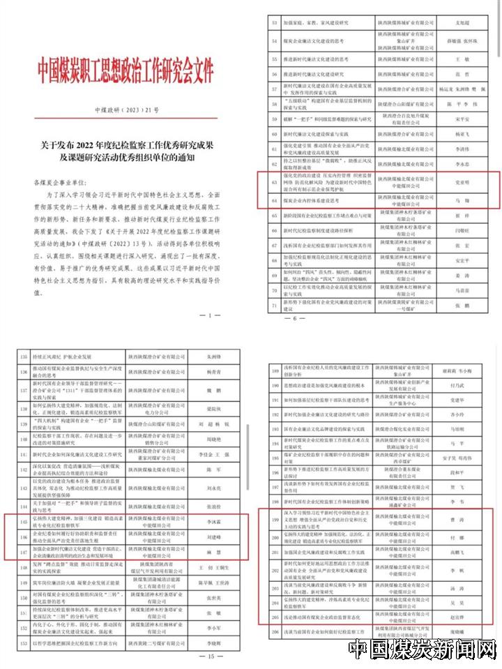 | 喜讯!陕西中能煤田有限公司12篇纪检监察工作研究成果获中煤政研会表彰 | |||