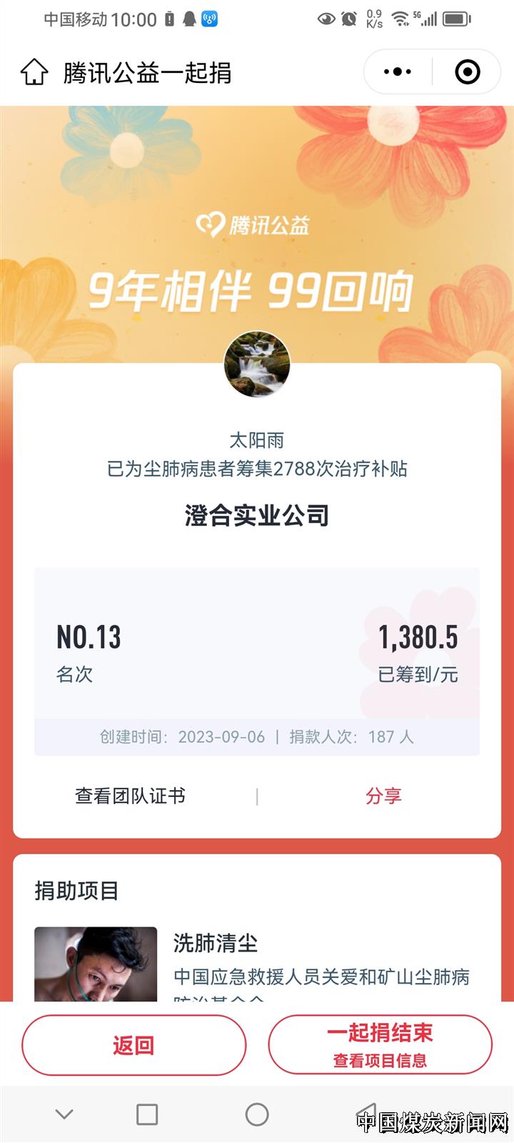 一年一度的“99公益日”如期而至, 今年的9月9日是第9个99公益日。连日来,该公司工会积极组织全体职工参加“99公益日”活动,为慈善事业奉献爱心,本次公益日活动为“洗肺清尘”捐助1380元。几年来,每到“99公益日”活动,该公司工会都会积极动员全体职工进行募捐,号召全体职工伸出援手,结合自身实际情况,奉献自己的爱心。仅从2019年至今,该公司工会四年来组织参加“99公益日”活动,共捐出1万余元。 据悉,“99公益日”是由中央网信办和国家社会组织管理局指导,多家公益慈善类组织、爱心企业、爱心媒体共同发起的网络募捐活动。“洗肺清尘”项目,是将筹集到的治疗款用来救助尘肺患者,让他们重拾生活的信心和生命的尊严,让他们的家庭重新拥有爱与希望。 ![]()