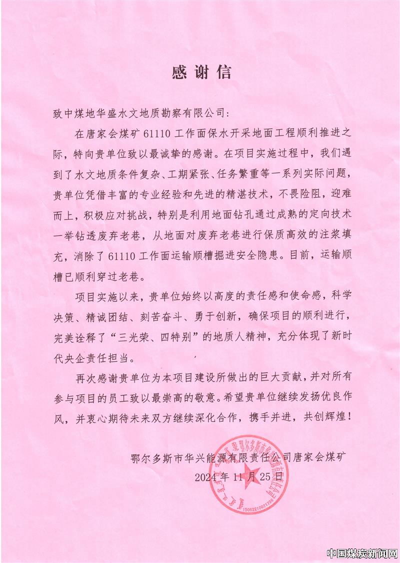 【本网讯】近日,中煤水文局一队收到鄂尔多斯市华兴能源有限责任公司唐家会矿发来的感谢信,对唐家会煤矿61110工作面保水开采地面工程项目全体人员临危受命,不畏险阻,迎难而上,利用地面钻孔定向技术一举钻透治理区遗留废弃老巷,并进行保质高效的注浆填充,消除61110工作面运输顺槽掘进安全隐患表示衷心感谢。![]() 该项目由中煤地华盛水文地质勘察有限公司承揽,中煤水文局一队负责组织施工,合同工期1171日历天。自2022年6月10日开工至今,共完成4个主孔43个分支顺层钻孔,钻探进尺38000余米,占比95%,目前项目进展顺利,有望提前4个月完成全部施工任务。 在项目实施过程中,面对治理区域水文地质条件复杂、工期紧张、任务繁重等一系列实际问题,项目全体员工凭借丰富的专业经验和先进的精湛技术,积极应对各种挑战。唐家会矿61110工作面运输顺槽掘进过程中,揭露2010年61101运输顺槽的一条废弃老巷,该老巷密闭时间长且存有大量积水,是61110运输顺槽掘进过程中的一个巨大安全隐患。项目技术人员日夜奋战,认真分析研判,制定钻孔轨迹及施工安全技术措施,利用地面钻孔通过定向技术精准钻透废弃老巷,并从地面对废弃老巷进行注浆填充,经井下掘进验证,老巷内被水泥完全填充,巷体结构完整,未发现积水及有害气体,成功消除了巷道掘进中的安全隐患。 唐家会矿在感谢信中表示,中煤地华盛水文地质勘察有限公司始终以高度的责任感和使命感,科学决策、精诚团结、刻苦奋斗、勇于创新,确保项目的顺利进行,完美诠释了“三光荣、四特别”的地质人精神,充分体现了新时代央企责任担当,并衷心期待未来双方继续深化合作,携手并进,共创辉煌!