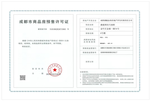 2月6日,鼎能房产公司金海项目公司经过严格审批,顺利取得了鼎能·国宾天韵项目6#楼的商品房预售许可证。