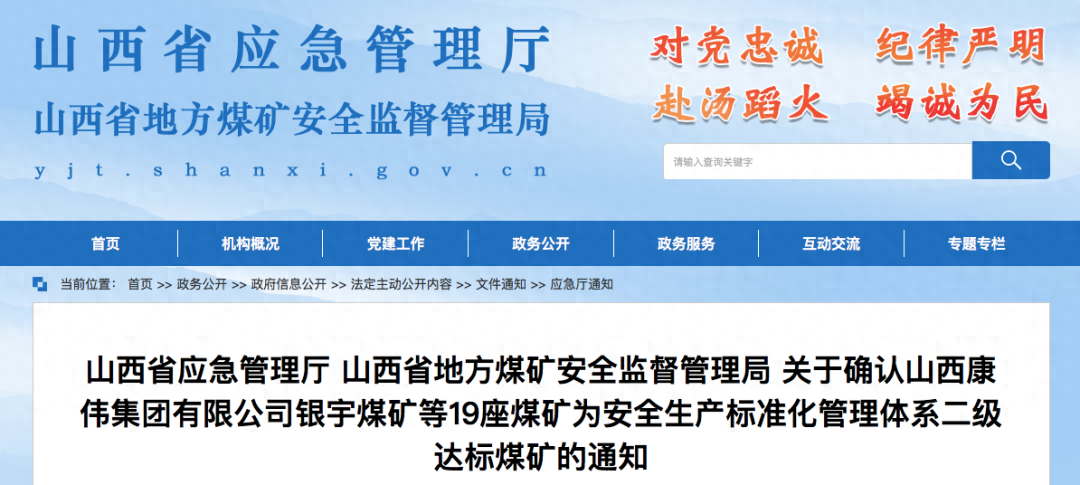根据国家矿山安监局《煤矿安全生产标准化管理体系考核定 级办法(试行)》和《煤矿安全生产标准化管理体系基本要求及 评分方法(试行)》有关规定,经考核并公示,确认山西康伟集团有限公司银宇煤矿等 19 座煤矿(见附件)为安全生产标准化 管理体系二级达标煤矿。有效期为自确认之日起 3 年。 一、山西康伟集团有限公司银宇煤矿等 19 座煤矿要在安全 生产标准化管理体系二级达标基础上,持续改进和完善安全生产 条件,进一步加强安全、生产、技术和现场管理,定期开展安全 生产标准化达标自检,不断提高安全生产标准化水平,保障安全 生产。 二、太原、朔州、忻州、晋中、长治、晋城、临汾、运城市 应急管理局要加强对达标煤矿的动态监管,督促其落实主体责 任,实现持续达标、动态达标。 山西省应急管理厅 山西省地方煤矿安全监督管理局 2024 年 2 月 19 日 附件 安全生产标准化管理体系二级达标煤矿(19 座) 1.山西康伟集团有限公司银宇煤矿 2.山西古交煤焦集团白家沟煤业有限公司 3.山西康伟集团有限公司福巨源煤矿 4.山西美锦集团锦富煤业有限公司 5.山西朔州平鲁区华美奥冯西煤业有限公司 6.山西朔州平鲁区华美奥兴陶煤业有限公司 7.山西忻州神达晋保煤业有限公司 8.山西潞安集团潞宁孟家窑煤业有限公司 9.山西忻州神达朝凯煤业有限公司 10.山西煤炭运销集团寿阳亨元煤业有限公司 11.山西灵石国泰红岩煤业有限公司 12.山西阳城山城煤业有限公司 13.山西阳城阳泰集团晶鑫煤业股份有限公司 14.山西煤炭运销集团阳城惠阳煤业有限公司 15.山西高平科兴赵庄煤业有限公司 16.山西高平科兴新庄煤业有限公司 17.山西省晋城晋普山煤矿 18.山西煤炭运销集团同富新煤业有限公司 19.山西曙光船窝煤业有限公司