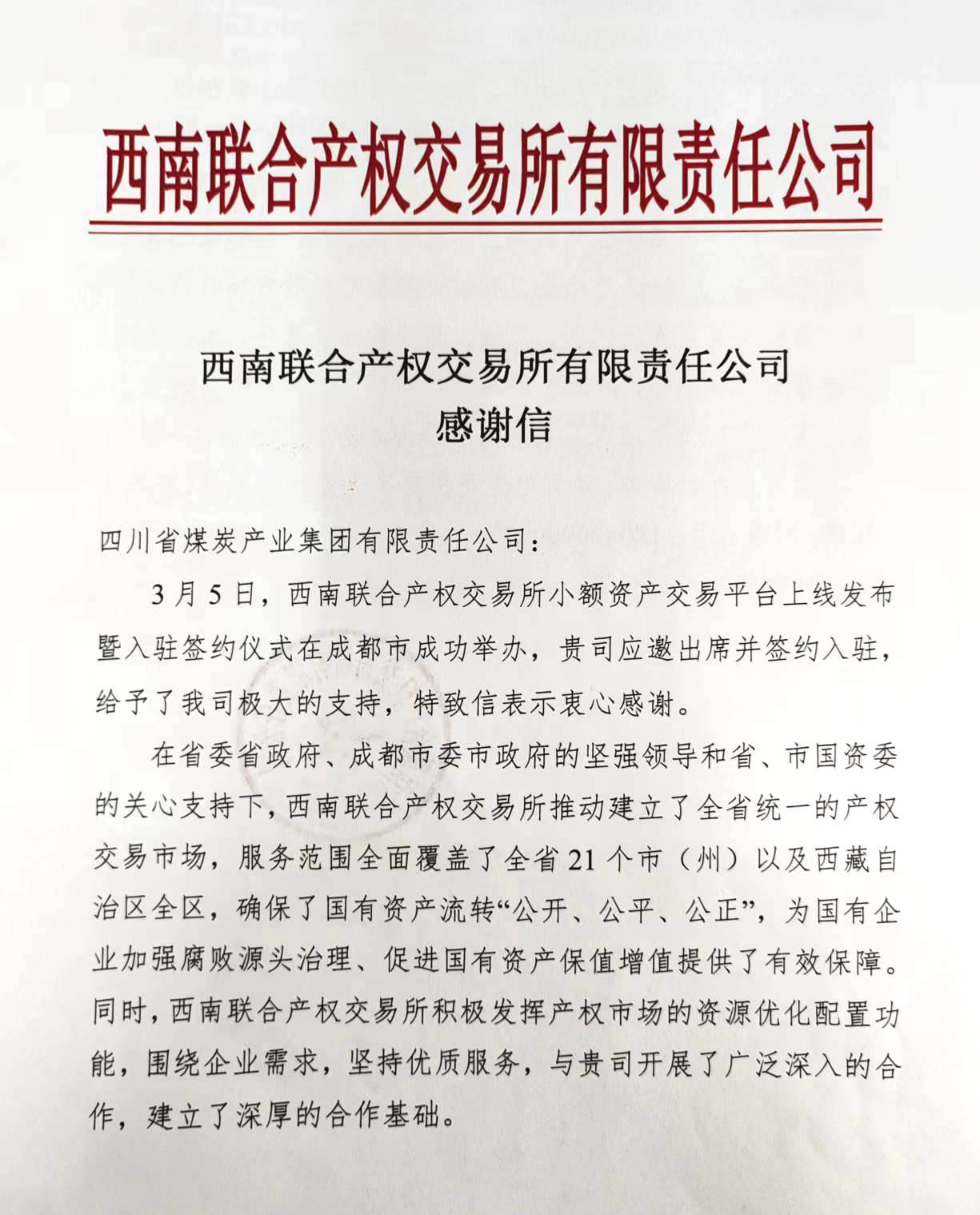 近日,川煤集团收到西南联合产权交易所感谢信,对川煤集团应邀出席西南联合产权交易所小额资产交易平台上线发布暨入驻签约仪式,并签约入驻表示衷心感谢。