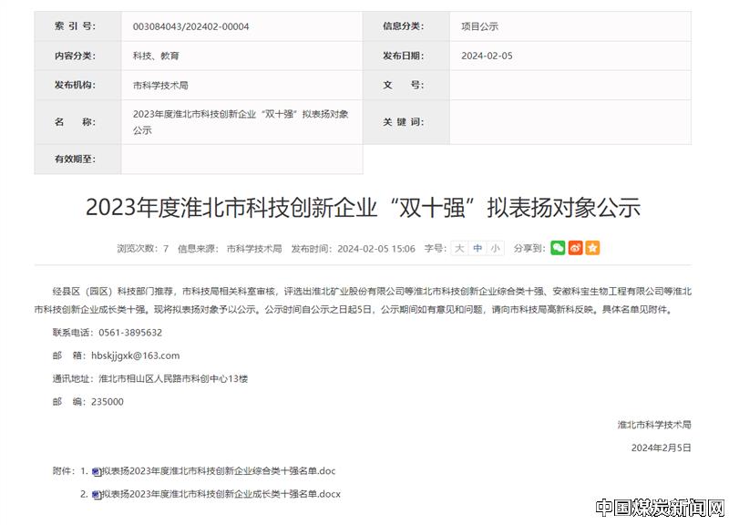 【本网讯】近日,淮北市科学技术局对2023年度全市科技创新工作成效显著、工作成绩突出的“双十强”企业给予通报表扬,通过知识产权、研发平台、成果转化等5项指标评定,中煤矿建特凿公司成功入选综合类十强名单。