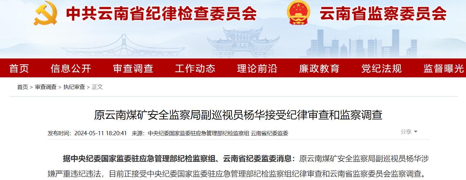 | 原云南煤矿安全监察局副巡视员杨华接受纪律审查和监察调查 | |||