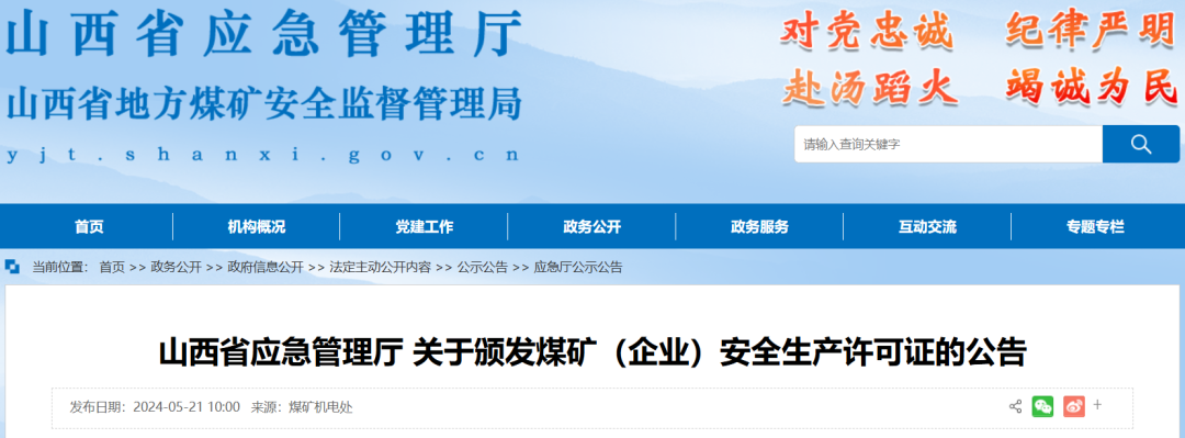 山西应急管理厅为24座煤矿(企业)颁发安全生产许可证。 据山西省应急管理厅网站消息,近日,山西省应急管理厅颁发煤矿(企业)安全生产许可证的公告,为山西灵石天聚鑫辉源煤业有限公司等24座煤矿(企业)颁发安全生产许可证。 以下为原文 ![]() 山西省应急管理厅关于颁发 煤矿(企业)安全生产许可证的公告 经研究,按照有关规定,为山西灵石天聚鑫辉源煤业有限公司等24座煤矿(企业)颁发安全生产许可证,现进行公告。 公告期:2024年5月21日至2024年5月27日。 2024 年5月20日 ![]()