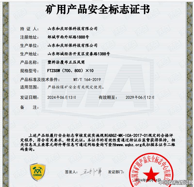 | 山东和庆环保科技公司喜获三项矿用产品安标证书 | |||