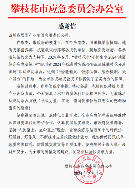 7月1日,攀枝花市应急办向川煤集团发来感谢信,对国家矿山应急救援川煤队在“攀枝花市‘守护生命·2024’地震综合应急演练”和“四川省2024年抗震救灾综合实战演练攀枝花分演练场”中的出色表现给予了充分的肯定! 据悉,国家矿山应急救援川煤队攀枝花分队在演练中,面对模拟的地震、洪水、泥石流等多种复杂灾害场景,人员迅速响应,行动敏捷,配合默契,凭借着精湛的救援技能和丰富的实战经验,在最短的时间内完成了被困人员的搜救、伤者的紧急救治以及危险区域的排查和处置等重要任务,圆满完成了四川省应急厅、攀枝花市应急管理局安排布置的演练科目及相关工作任务。展现出了极高的专业素养和军事化风貌,展现了川煤集团、华荣能源公司责任担当和良好的精神风貌,坚决捍卫“践训词精神 铸川煤铁军”的铮铮誓言。