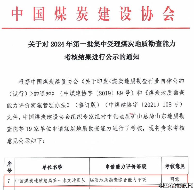 | 中煤水文局一队通过煤炭地质勘查综合能力甲级认定 | |||