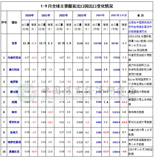 2025年前三季度全球主要煤炭出口国出口变化情况