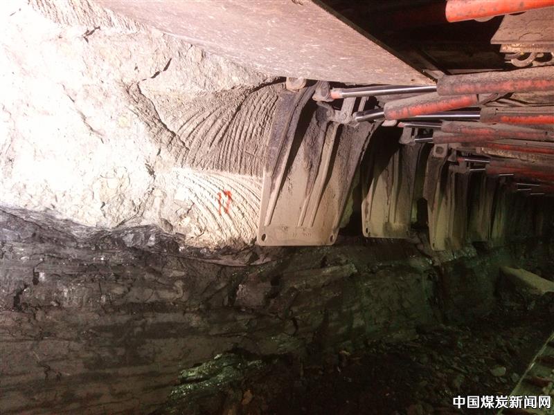破局:技术利剑,劈开生产“冻土层” 今年5月,当8521工作面推进至1105米处,因工作面中部底板隆起,出现普氏系数超过7的大面积坚硬矸石层,最大面积达到工作面的67%,白色的矸石犹如一道“铁壁”横亘面前。采面破矸导致工作面生产效率急剧下降,设备损耗大幅增加,大块矸石频繁卡堵煤仓,对生产造成严重影响。 “这是一场必须打赢的技术攻坚战。”矿井主要负责人表示。面对这一技术难题,矿井迅速组织技术力量开展攻关。技术团队深入现场实地勘查,系统分析矸石分布特征及岩体力学特性,及时制定了《8521工作面破矸回采专项技术方案》,很快方案从纸上来到现场,矿井根据现场实际情况采取了差异化技术措施,通过上顺槽垫底,下顺槽挑顶来整体调整工作面与夹矸层的夹角以减小破矸面积,同时根据工作面底板揭露情况精准调整工作面,有效避开了矸石主要分布区域。对于剩余的坚硬矸石区域,采用了工作面超前注水及煤壁爆破弱化技术,有效降低了矸石完整性。在设备参数调整方面,降低了采煤机截割速度,同步更换高强度和高耐磨性截齿,显著提升了设备对坚硬矸石的适应性。
