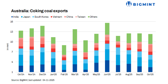 据印度商工部(MinistryofCommerceandIndustry)11月24日发布的煤炭进口数据显示,2025年1-9月,印度煤炭进口量累计为1.89亿吨,较上年同期下降2.3%。 其中,9月份印度煤炭进口量为1796万吨,同比减少2.0%,环比下降5.9%,自5月份以来已连续四个月环比下降。 ![]() 10月份印度动力煤进口环比下降7% 据印度BigMint平台网站11月14日发布的信息,2025年1-10月,印度动力煤(Non-cokingcoal,非焦煤)进口量为1.39亿吨,较去年同期的1.49亿吨下降约6%。 尽管因非季节性降雨和凉爽天气影响,印度国内煤炭产量出现下滑,而10月份的煤炭进口量仍然环比下降近7%。其中,来自印度尼西亚的煤炭进口(主要用于发电的煤炭)下降4%,而来自南非的进口则因钢铁行业需求稳定而增长4%。来自俄罗斯和美国的煤炭进口也出现下降。 10月份,印度所有主要港口的煤炭进口到港量环比都出现大幅下降。Mundra港和Vizag港的总卸货量环比下降了45%至50%,而Krishnapatnam港则下降了23%。 动力煤进口市场的主要变化趋势: 火电发电量下降:数据显示,前10个月,由于异常强劲且持续时间长的季风、较凉爽的天气以及对冷却需求的减少,火电发电量同比下降3.5%。虽然国内生产总值(GDP)增长超过6.5%,但该时期电力需求仅微增1%。天气条件的变化直接影响了动力煤进口,尤其是来自印度尼西亚的进口,前10个月进口总量同比下降了10%。 自南非进口的煤炭增加10%:印度国内海绵铁行业的需求保持稳定,拉动南非煤炭进口增长10%。尽管钢铁市场出现下滑,但预计2025年印度海绵铁产量将超过5500万至5600万吨。因此,从南非进口的高固定碳、低挥发分煤仍然保持高位。 可再生能源发电量大幅增长:数据显示,2025年前10个月,印度太阳能和风能发电量等(包括生物燃料和储能)同比增长22%。充沛的降雨和延长的季风季节使水电产量增长14%。 需要指出的是,虽然印度已提前五年实现可再生能源在总装机容量中的占比50%的目标。然而,电网整合和储能基础设施的不足,持续强化了对传统火电的依赖。 由于需求疲软和季风影响,10月份印度煤炭产量同比下滑9%,其中国有印度煤炭公司(CIL)当月产量环比下降3%。不过,由于天气状况良好,整个2026财年的煤炭进口量可能还会有所下降。 展望未来,随着季风季节过后印度国内煤炭开采量预期增加,以及可能在财政年末之前为达成目标而出现的抢跑现象,可能会导致国有印度煤炭公司(CIL)商业拍卖的煤炭产量和销售配额增加,从而提升对各行业的供应量。 然而,天气模式对国内生产和采矿基础设施的巨大影响表明,即使调度出现微小变化或供应短缺,也可能引发市场恐慌,迫使消费者转向进口。 10月份印度炼焦煤进口环比下降24% 印度分析机构BigMint平台11月7日发布的信息显示,2025年10月,印度焦煤进口量下降至470万吨,环比9月份的620万吨下降24%,而与2024年10月的430万吨相比仍高出9%。 10月份,澳大利亚对印度的炼焦煤出口从350万吨降至290万吨,俄罗斯的出口量也大幅下降,从150万吨降至50万吨。美国的出口量从70万吨降至50万吨。而从莫桑比克的进口量保持基本稳定为40万吨,而印度尼西亚和加拿大的进口供应量均为20万吨。 炼焦煤进口下降的主要原因是: 主要钢厂下调钢材价格导致炼焦煤进口减缓:月初,为应对9月底的市场价格水平,主要钢厂将10月初交货的螺纹钢价格上调了最高1000卢比/吨(约合11美元/吨)。然而,10月中旬贸易层面的高炉螺纹钢报价出现下滑,加之排灯节(Diwali)前市场情绪低迷,因此主要钢厂纷纷提供折扣或降低挂牌价。同样,在热轧卷板(HRC)市场,主要钢铁制造商将10月销售的热轧卷(HRC)和冷轧卷(CRC)价格较9月初第一周的价格下调了750-1500卢比/吨(8-17美元/吨)。由于需求疲软、供应过剩和高库存对价格形成压力,市场依然低迷。买家仅限于采购即时的焦煤需求量,避免大量预订。 焦煤价格上涨推高进口成本:BigMint编制的印度到岸价(CFR)优质硬焦煤指数因澳大利亚8月报价上涨而在10月份的印度进口价中出现了5%的环比上涨。近期,钢铁焦炭市场因供应紧张和需求强劲又迎来连续第二轮涨价。因此,印度买家被迫接受更高的煤炭报价,尽管钢铁价格低迷,这仍导致了原料输入成本的上升。 预计11月的炼焦煤进口将得到恢复,因为印度钢铁厂在节日过后和冬季需求来临之前会补充库存。不过,在海运价格稳定且工厂库存充足的情况下,采购可能会保持一定的时机选择性。