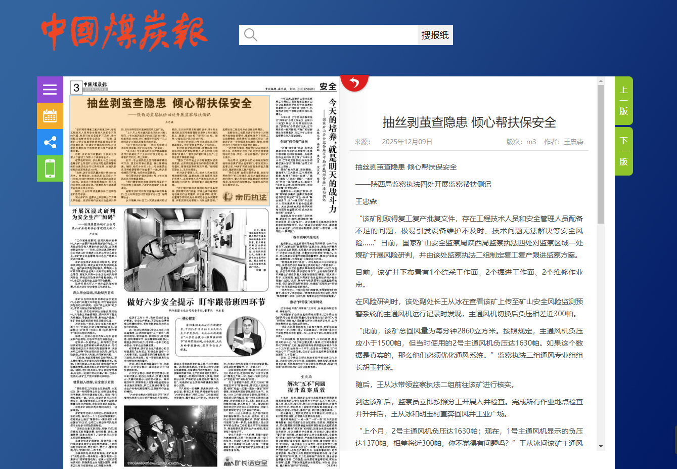 “该矿刚取得复工复产批复文件,存在工程技术人员和安全管理人员配备不足的问题,极易引发设备维护不及时、技术问题无法解决等安全风险……”日前,国家矿山安全监察局陕西局监察执法四处对监察区域一处煤矿开展风险研判,并由该处监察执法二组制定复工复产跟进监察方案。 目前,该矿井下布置有1个综采工作面、2个掘进工作面、2个维修作业点。 在风险研判时,该处副处长王从冰在查看该矿上传至矿山安全风险监测预警系统的主通风机运行记录时发现,主通风机切换后负压相差近300帕。 “此前,该矿总回风量为每分钟2860立方米。按照规定,主通风机负压应小于1500帕,但当时使用的2号主通风机负压达1630帕。如果这个数据是真实的,那么他们必须优化通风系统。”监察执法二组通风专业组组长胡玉村说。 随后,王从冰带领监察执法二组前往该矿进行核实。 到达该矿后,监察员立即按照分工开展入井检查。完成所有作业地点检查并升井后,王从冰和胡玉村直奔回风井工业广场。 “上个月,2号主通风机负压达1630帕;现在,1号主通风机显示的负压达1370帕,相差将近300帕,你不觉得有问题吗?”王从冰问该矿主通风机值班司机刘某。 “这个我也不太懂……我只是做好记录后给领导看,他们也没说啥。”刘某说。 “是不是1号主通风机负压传感器管路进气口被堵住了?”王从冰对胡玉村说,并借助矿灯的光,爬上风硐。 打开1号主通风机负压传感器管路进气口后,胡玉村用铁丝探查,确认管路畅通。随后,他们分头把1号、2号主通风机负压传感器管路仔细查看了一遍,确认老化情况不严重,也没有出现破损。 他们要求该矿尝试互换1号、2号主通风机负压传感器管路。 “我们需要制定措施并审批报备后才可以切换主通风机。”该矿机电副矿长张某某说。 在要求该矿尽快制定措施并审批报备后,王从冰和胡玉村回到该矿办公区,与同事会合。 次日清晨,待6名工人完成主通风机切换后,王从冰和胡玉村随即动手,将1号主通风机负压传感器管路安装到2号主通风机上,数据从1660帕下降到1380帕。彼时,U型负压计显示为1390帕。 “经过分析发现,2号主通风机负压传感器损坏。你们要抓紧更换。”王从冰说。 针对检查发现的问题,监察执法二组现场约谈该矿实际控制人、矿长和总工程师等“关键人”,要求该矿暂时停止生产,立即全面开展隐患排查。 “整改工作不能止步于隐患整改或设备更换,必须深挖隐患背后的思想松懈、责任虚化、管理粗放等深层次问题。”在问题反馈会上,王从冰指出。 针对该矿管理人员、技术人员存在思想麻痹等问题,监察执法二组监察员与该矿负责人、各级管理人员开展座谈交流,开展风险分析研判,并制定重大风险管控措施。 “你们要对照相关规程标准对设备安装、使用情况进行排查,对井上井下在用机电设备进行全面摸底,从设备采购、使用、处置等方面对机电设备实行全生命周期管理,并落实好机电管理人员岗位责任制。”监察执法二组机电专业组组长李勇说。 监察执法二组要求该矿安排专人对照相关法律法规要求,重新梳理井下在用工业视频情况,坚决做到“无视频不作业”,并就该矿进一步加强信息化建设、管理,按要求及时上传相关资料等提出建议。 “这次帮扶指导,帮助我们认识到自己的不足,也帮我们找到了补齐技术和管理短板的方法,我们一定全面整改。”该矿矿长表示。 与此同时,监察执法四处将有关情况通报县级煤矿安全监管部门,督促其加大监管力度,待该矿完成全面隐患排查及整改后,重新组织复工复产验收。 “我们坚持‘监察与服务并重,执法与帮扶同行’的工作理念,在加大监察执法力度的同时,着力加强对被监察煤矿的帮扶指导,坚决防范遏制事故。”监察执法四处处长薛宏达说。