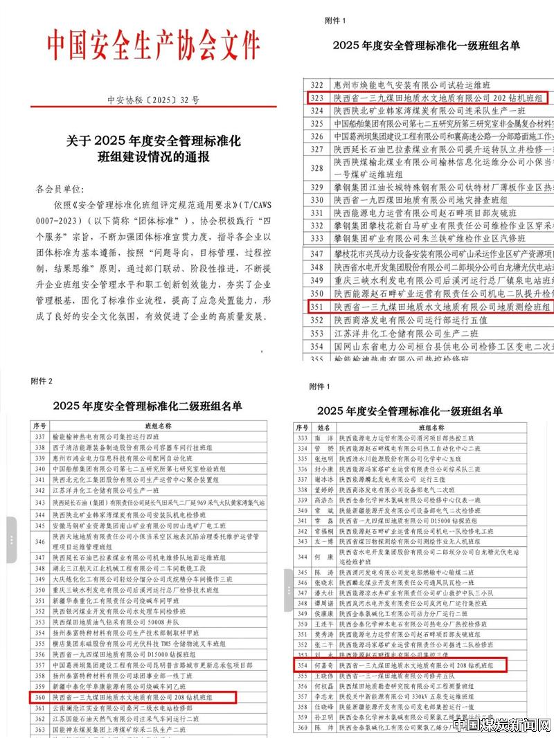 【本网讯】12月12日,中国安全生产协会发布《关于2025年度安全管理标准化班组建设情况的通报》,经过逐级遴选、严格评审,陕煤地质一三九水文公司斩获多项佳绩。202钻机班组、地质测绘班组被评定为安全管理标准化一级班组,208钻机班组被评定为安全管理标准化二级班组,208钻机班组班长何嘉奇荣获优秀班组长称号。 ![]() 班组作为安全生产的“最后一米”,是企业安全管理的基石与关键。一三九水文公司自三年前启动安全管理标准化班组创建工作以来,始终锚定“筑牢一线安全防线”目标,深入学习贯彻《安全管理标准化班组评定规范通用要求》(T/CAWS0007-2023)标准,积极对标行业先进典型,在实践中探索,在摸索中完善,逐步构建起贴合公司工作实际的班组安全管理体系。此次荣誉的获得,既是对公司班组建设成果的肯定,更是全体一线班组成员凝心聚力、真抓实干的有力见证。 征程万里风正劲,重任千钧再出发。公司将以此评定为契机,持续深化安全管理标准化班组建设工作,总结推广优秀班组的经验做法,以点带面推动全员安全意识和管理水平再上新台阶,为公司高质量发展筑牢坚实的安全屏障。