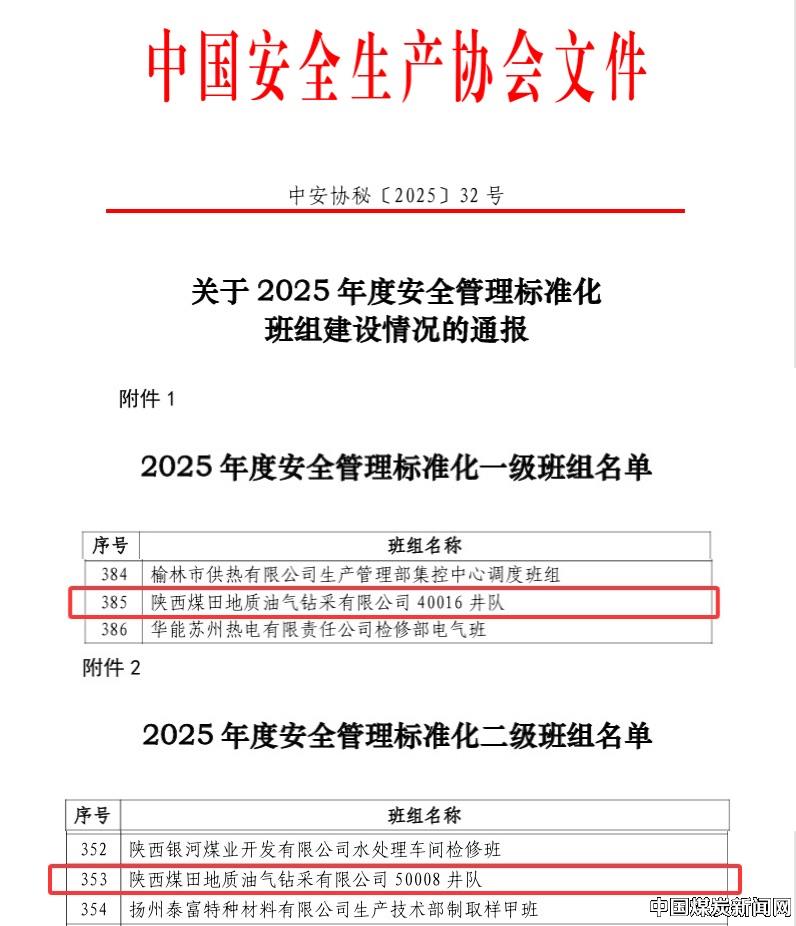 | 喜报!油气钻采公司40016、50008井队 分别荣获中国安全生产协会2025年度 安全管理标准化一、二级班组称号 | |||
