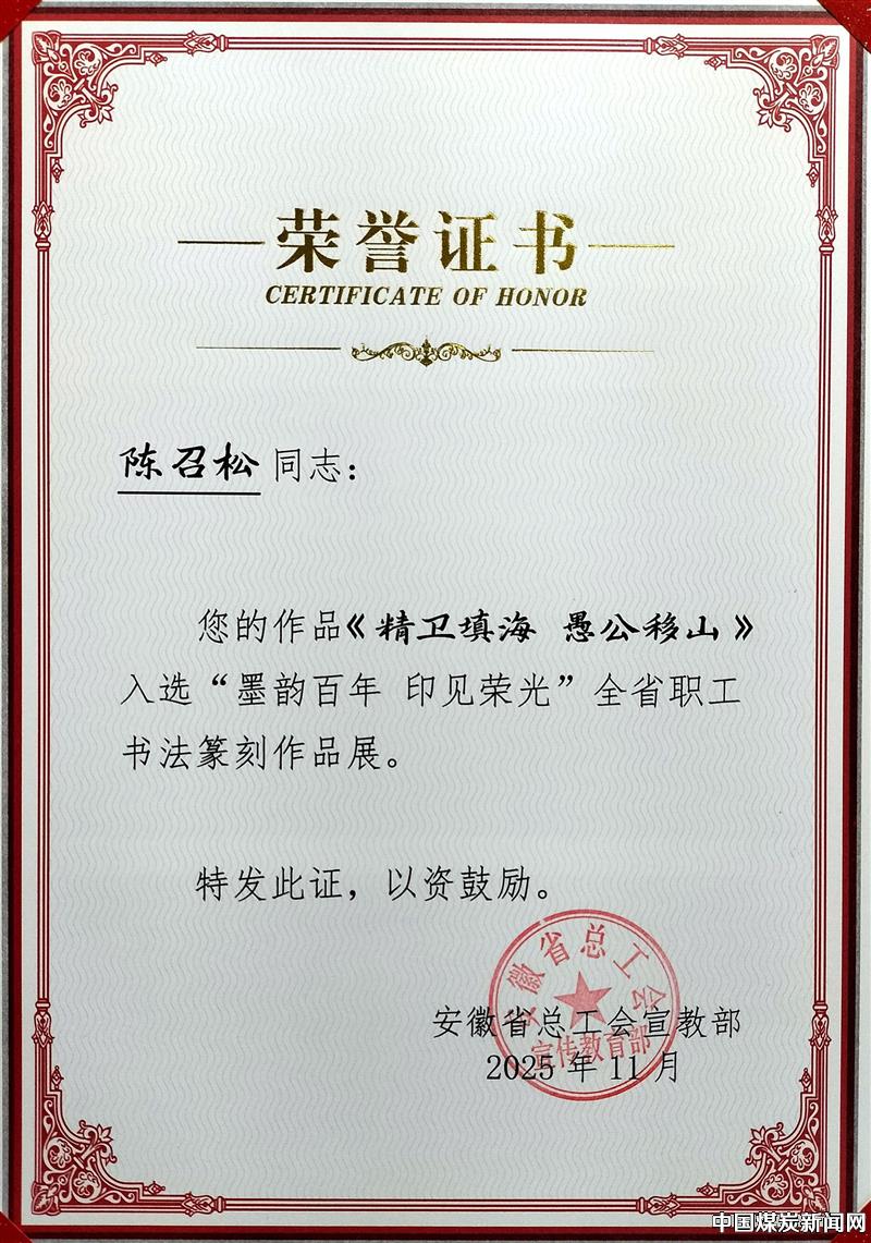 【本网讯】近日,淮北矿业集团孙疃煤矿职工陈召松收到安徽省总工会寄来的荣誉证书,陈召松创作的隶书楹联作品《精卫填海、愚公移山》,入选安徽省“墨韵百年、印见荣光”职工书法篆刻作品展。